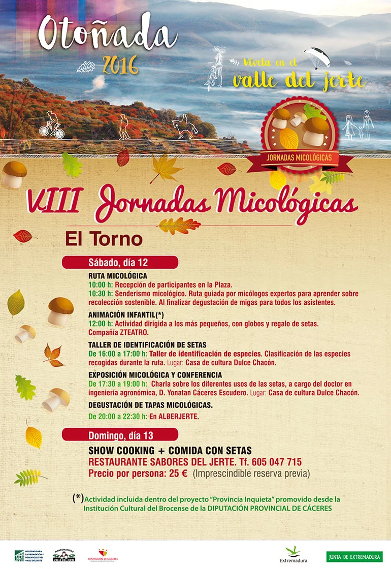 • 14:00 h: La mañana del domingo se desarrollará un Show cooking seguido de una comida especial en Restaurante Sabores del Jerte (Plaza Mayor de El Torno, 1). En el Show conoceremos diferentes formas de preparar estas delicias del otoño y la comida estará especialmente diseñada para la ocasión y elaborada, por supuesto, con setas. El precio de este evento del domingo es de 25 €/persona y se abonará in-situ.