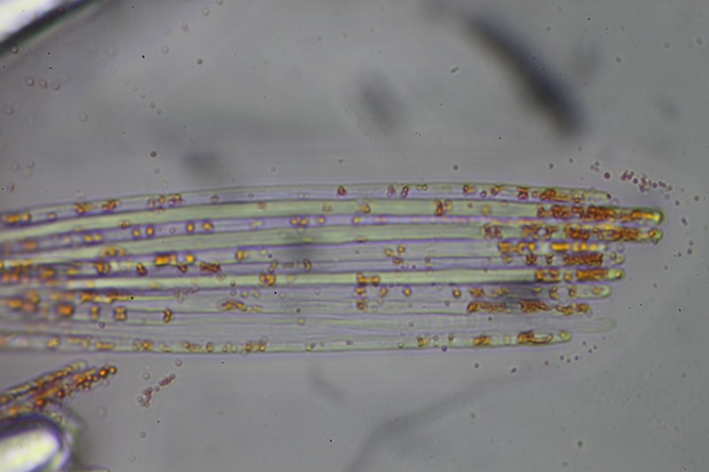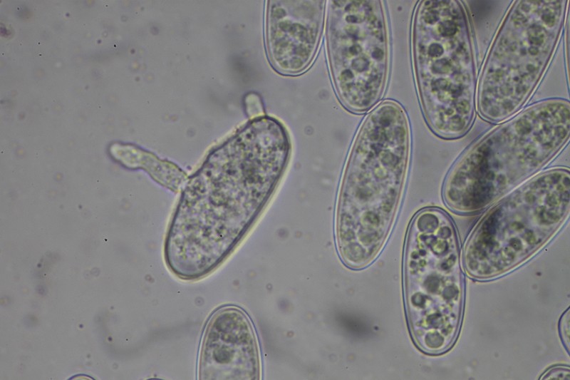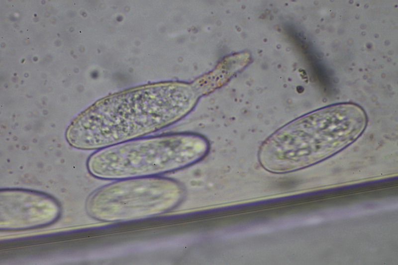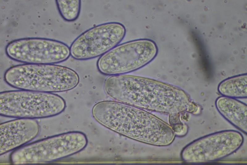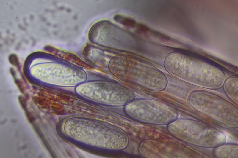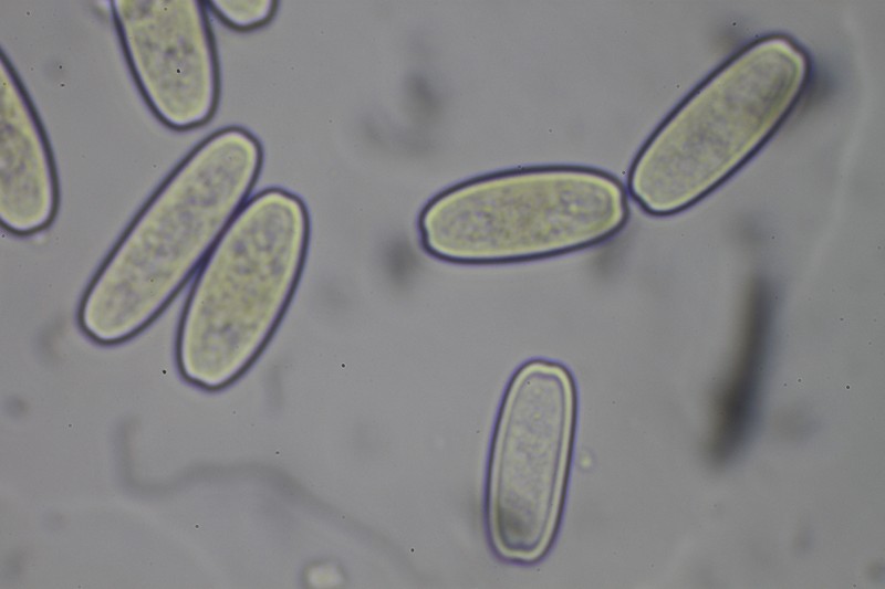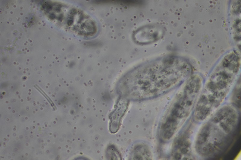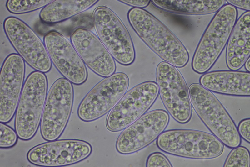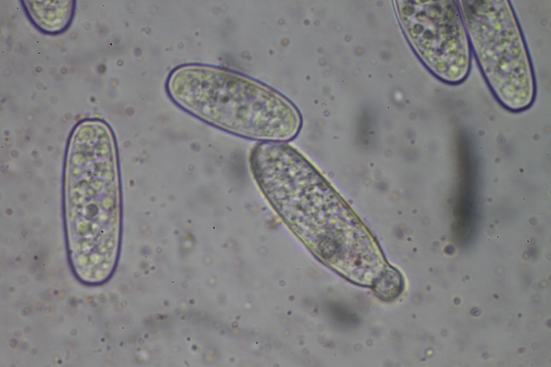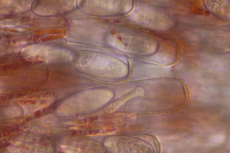 Esporas sin grandes gútulas lipídicas, de un tamaño que oscila entre 27-39 x 10-12 micras, según la medición realizada. Debemos tener en cuenta que el tamaño de las esporas es muy variable, por lo que no es un carácter concluyentemente diferenciador.
