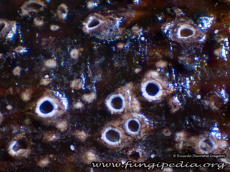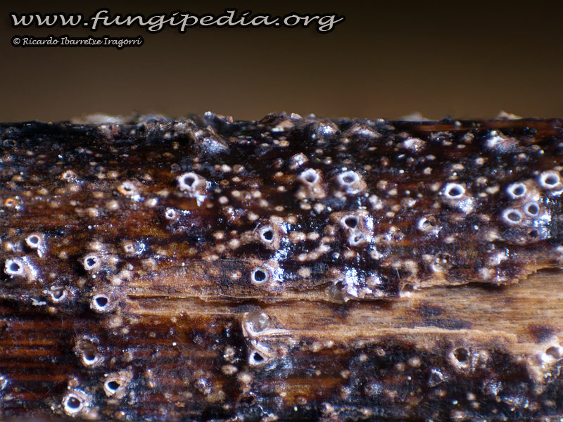 Ascoma de 0,5 mm de diámetro embutido en la madera . Con un himenio de color crema alojado en el interior del sustrato y margen blanquecino visible que dependiendo de la humedad y de la dureza de la corteza se rompe en forma de estrella o no.