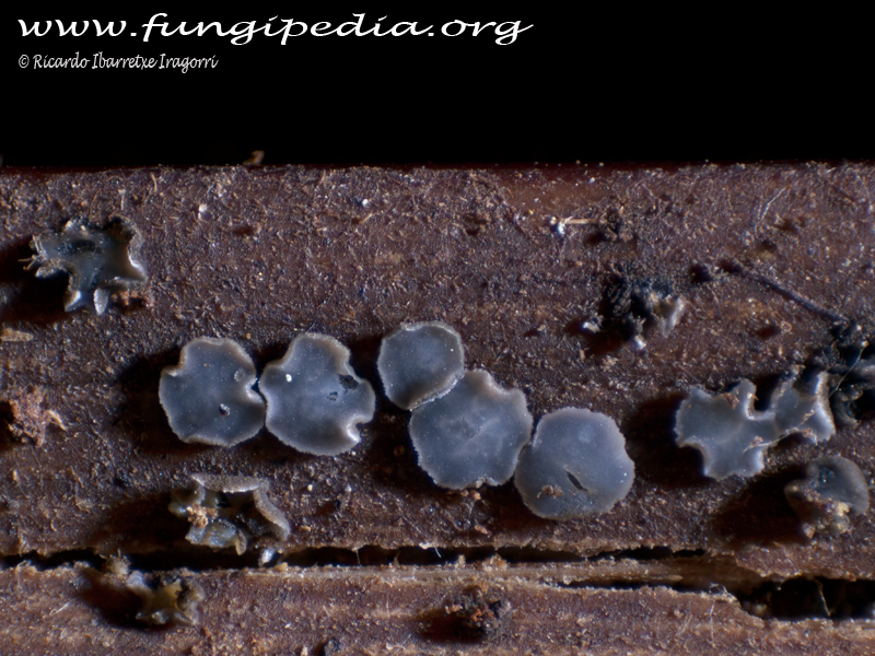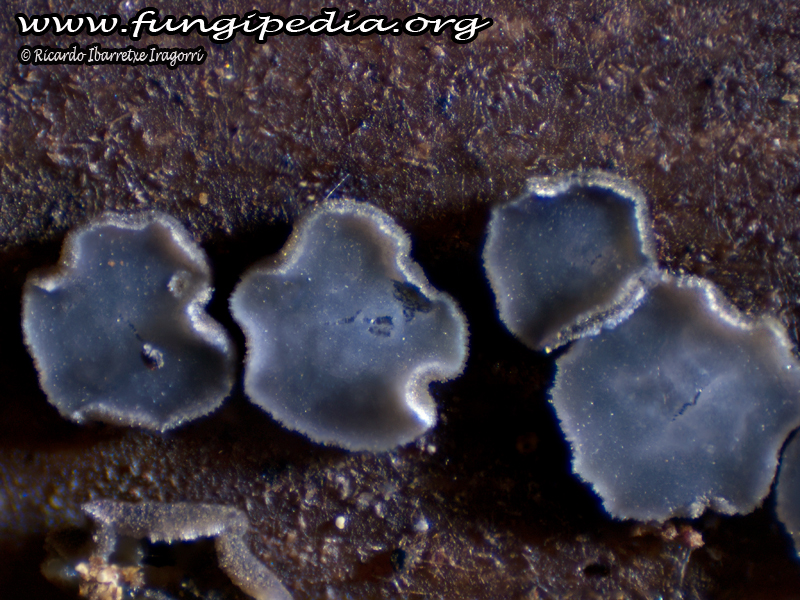 Hola chic@s, ascoma sésil de hasta 1mm de diámetro. De joven esférico, blanco. Muestra excípulo y un punto central más oscuro(himenio)que se va abriendo y tornando gris hasta extenderse completamente. Una vez maduro sus bordes se elevan y lobulan confiriéndole un aspecto estrellado.