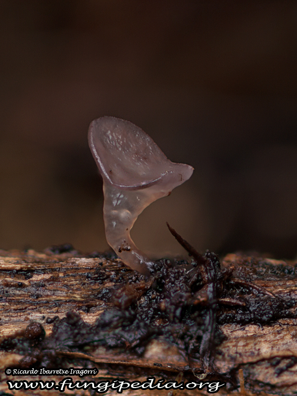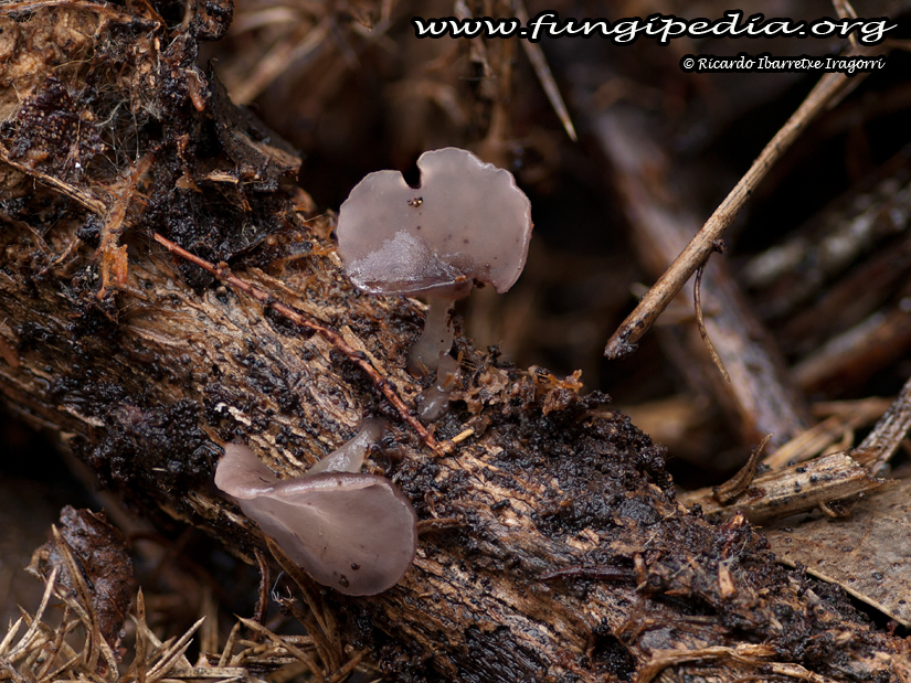 Ascomas: Gelatinosos de 1 a 6 mm con himenio liso, discoideo o umbilicado y pie corto. Crecen separados o agrupados y presentan un color rosa violáceo.