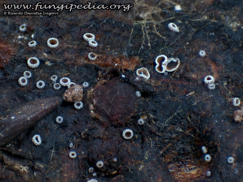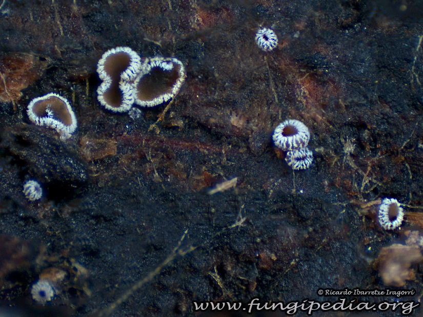 Apotecio sésil <1mm, con una distribución de pelos blancos en forma radial, se asemeja en un principio a un bobinado toroidal. A medida que madura, va dejando entrever un himenio o parte fértil de pigmentación marrón.