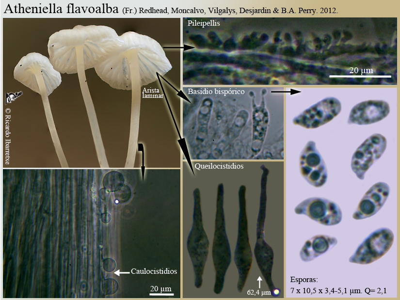 Posición taxonómica: Fungi, Basidiomycota, Agaricomycotina, Agaricomycetes, Agaricomycetidae, Agaricales, Marasmiaceae, Atheniella flavoalba.