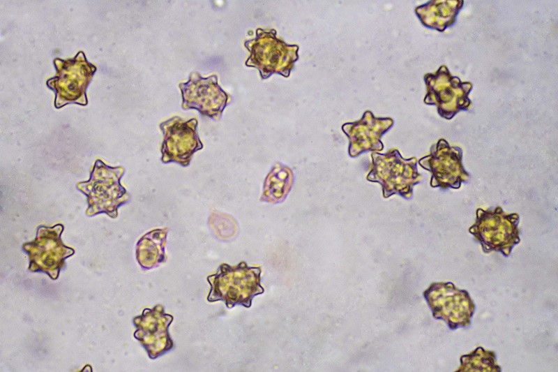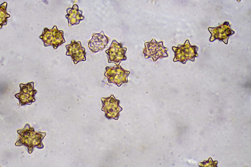 Esporas de 8 a 12 micras de diámetro, con protuberancias muy marcadas, que le confieren un aspecto estrellado que da nombre a la especie.