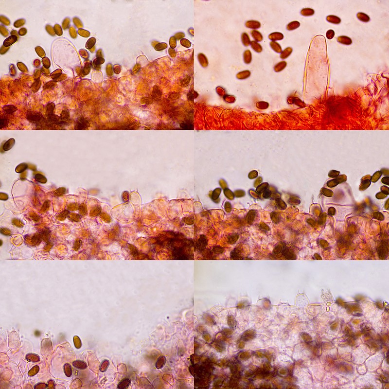Basidios tetraspóricos. Esporas cilíndico-elipsoidales, en forma de alubia, de 8-8,5x4-4,5 micras, poro germinativo centrado, bien marcado.