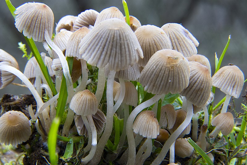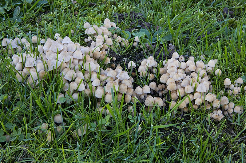 Coprinellus disseminatus es una especie frecuente que brota generalmente formando grupos densos.
