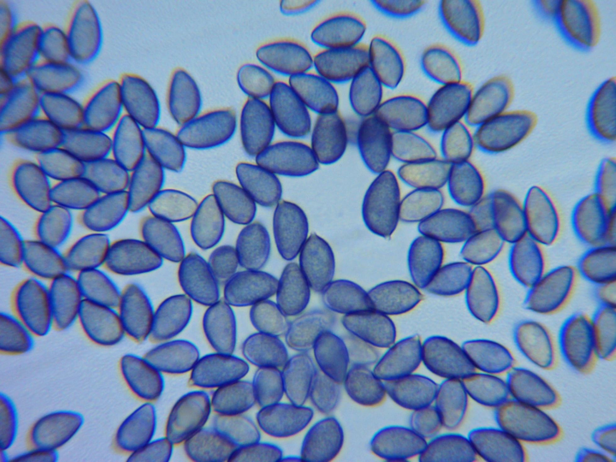 Esporas a 1000 aumentos, con forma de almendra y con apículo, de color ocre claro y virando a marrón rojizo en Melzer (dextrinoides). Junto con la imagen os dejo el resultado de mis mediciones.
