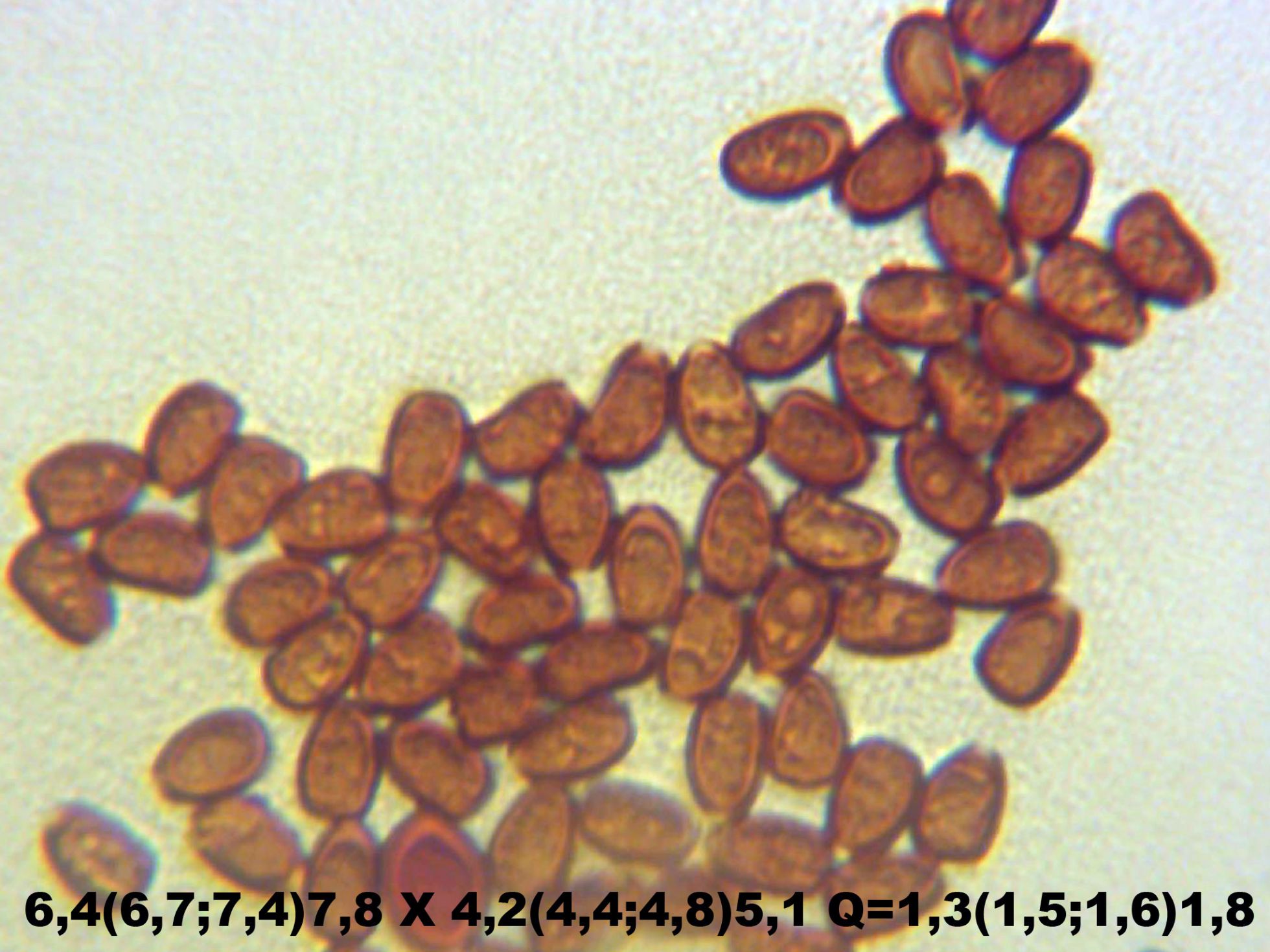 Esporas con reactivo de Melzer y el resultado de mis mediciones, por las medidas encajan con Psathyrella spadicea, aunque no se parece para nada el aspecto verrucoso que presentan.