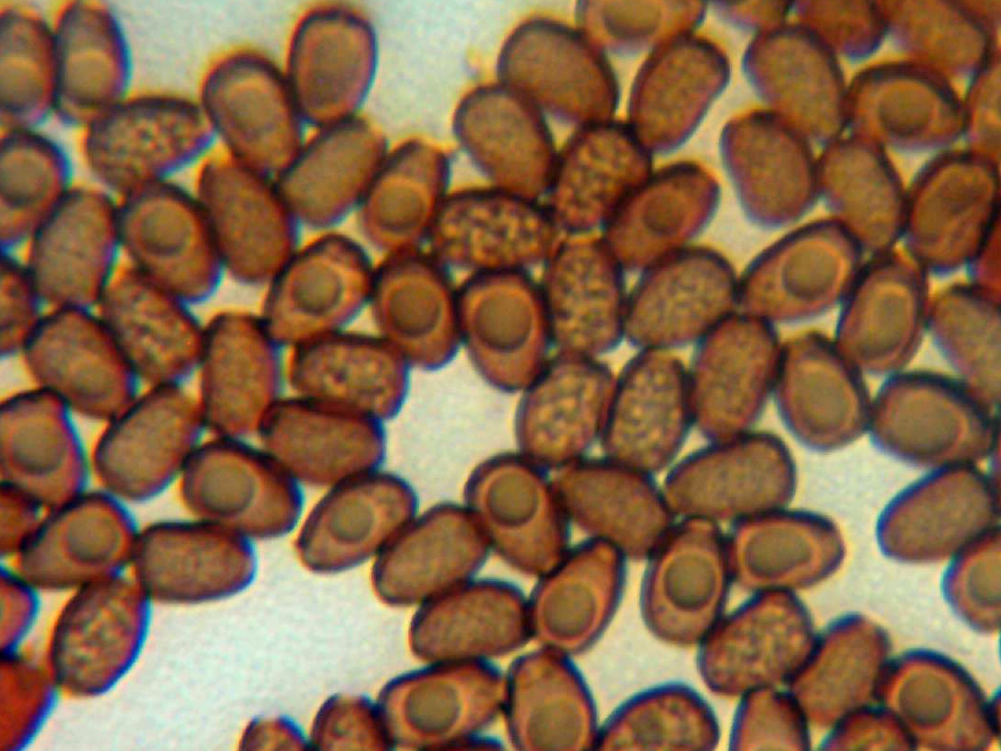 Esporas con rojo congo, se observa como 2 caras (una rugosa y otra con una vacuola en su interior) este aspecto rugoso contrasta con el aspecto liso de la mayoría de las esporas del género Psathyrella. Del género Psathyrella con esporas de un aspecto parecido hay la Psathyrella cernua y la Psathyrella olympiana. Descarto que se trate de la Psathyrella olympiana ya que esta presenta las esporas de mayor tamaño y mas ovaladas y también la Psathyrella cernua ya que a pesar de que las medidas de las esporas encajan , no me cuadra el aspecto macroscópico. El aspecto de las esporas encaja con las de Lacrymaria lacrymabunda, aunque en este caso las de mi especie son de menor tamaño.