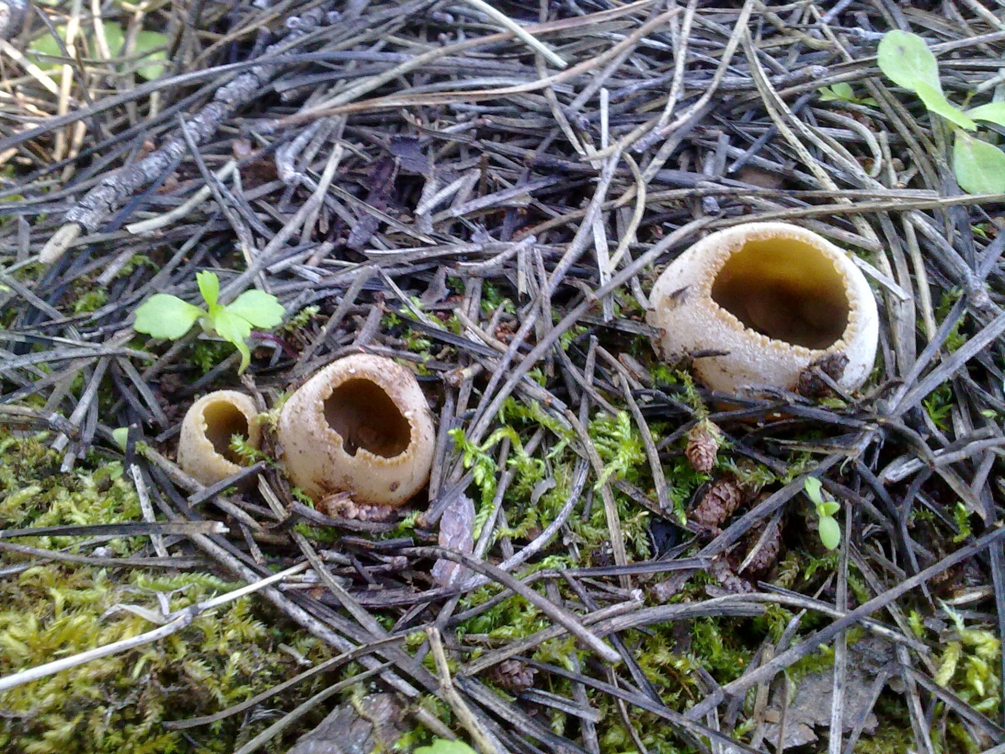 Hola amigos, hoy en mi paseo entre pinos me encontré con este grupo de tres individuos de Pezizaceae, que parecían como si estuvieran cantando