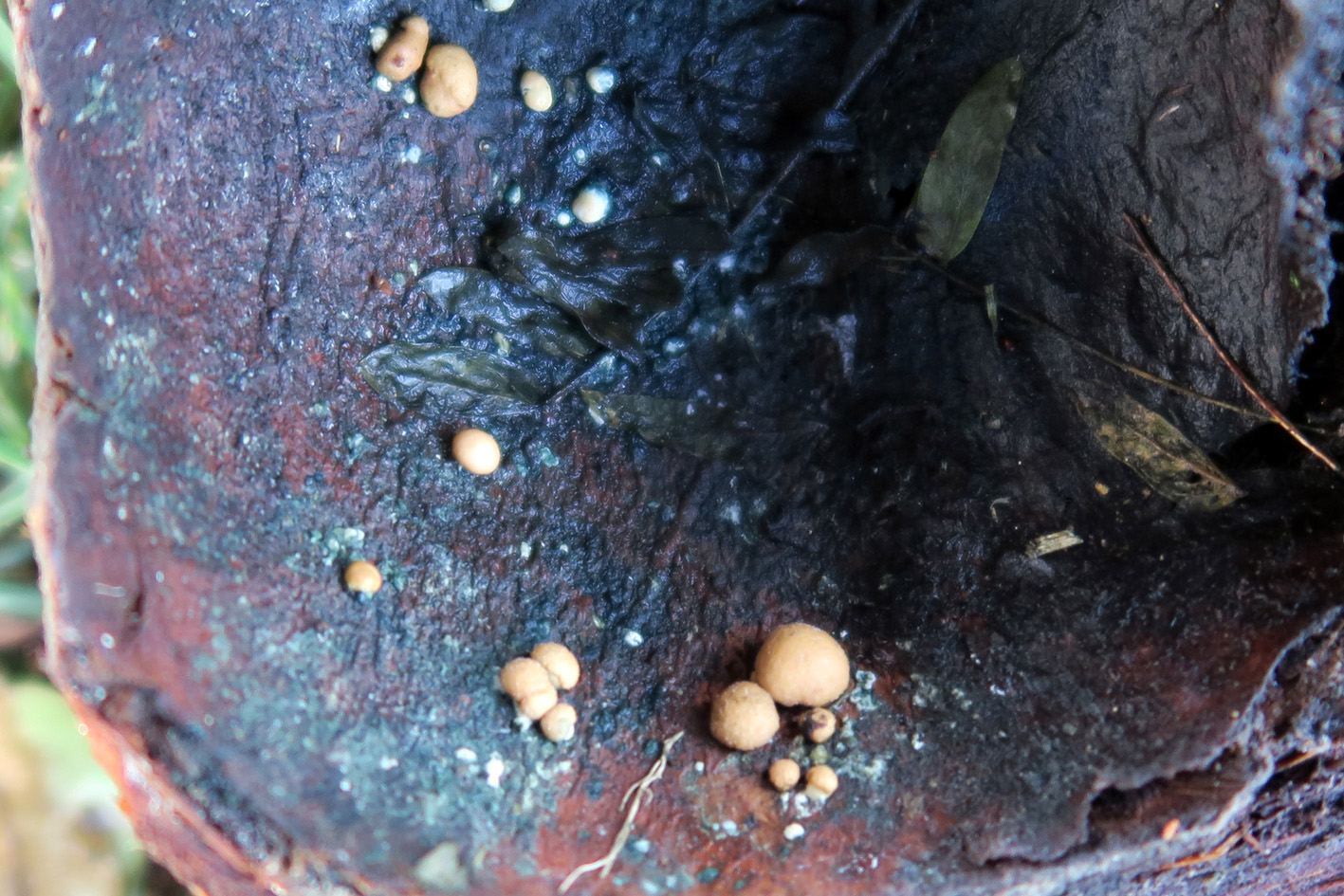 Hypocrea rufa en una cáscara de coco, con su anamorfo al lado, Trichoderma viride. De forma esférica y de unos pocos mms.