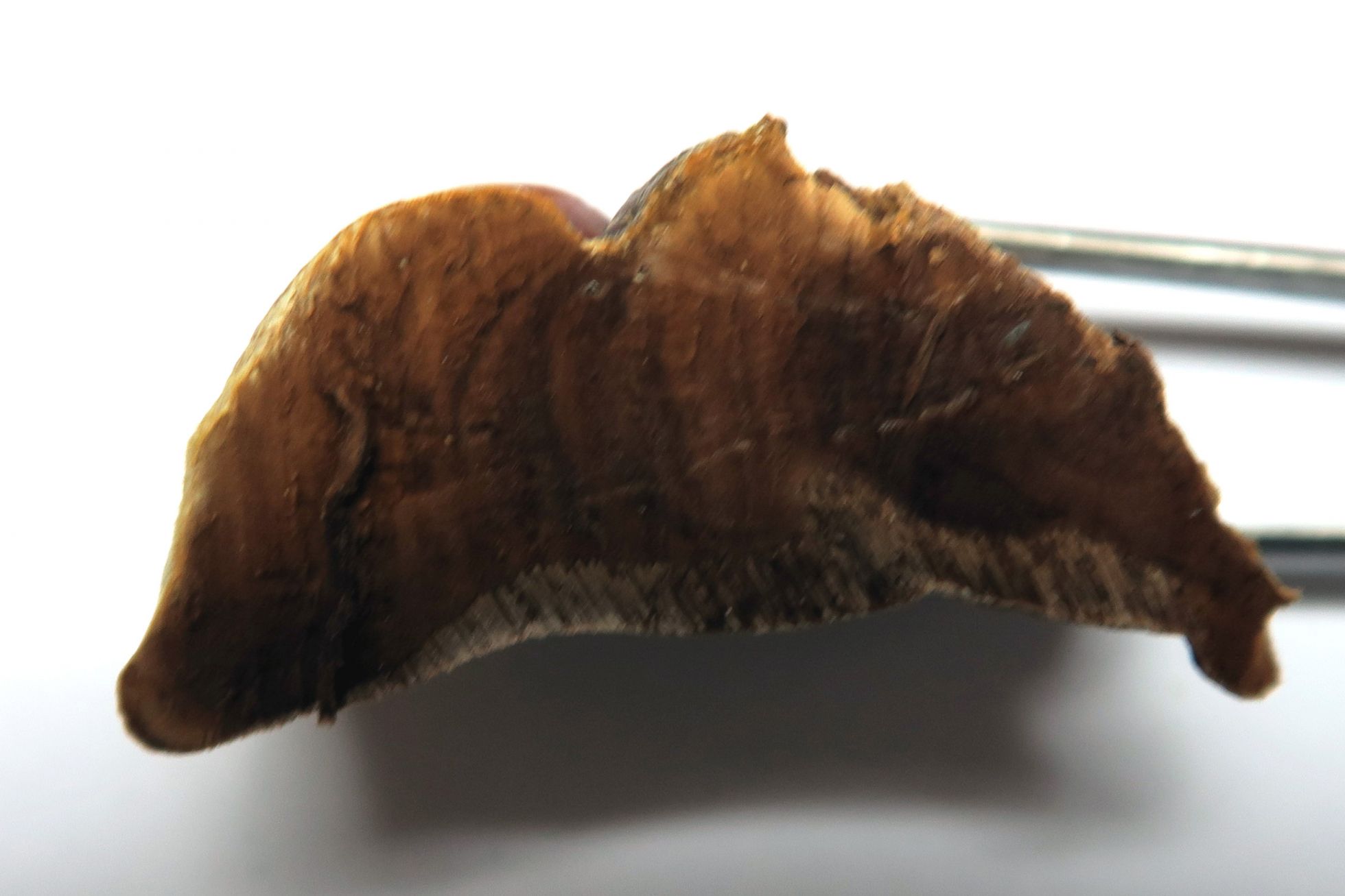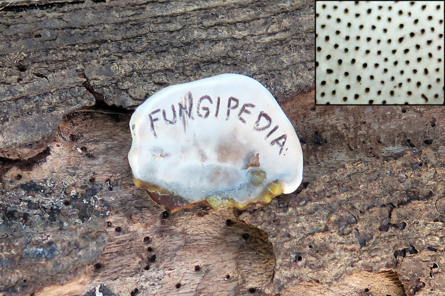 La carne de color marron y muy dura y coriácea, de textura similar a la leña, en este ejemplar con una sola capa de tubos ya que se trata de un primordio, aunque se van estratificando en capas a una por año, los tubos de color marron rojizo.