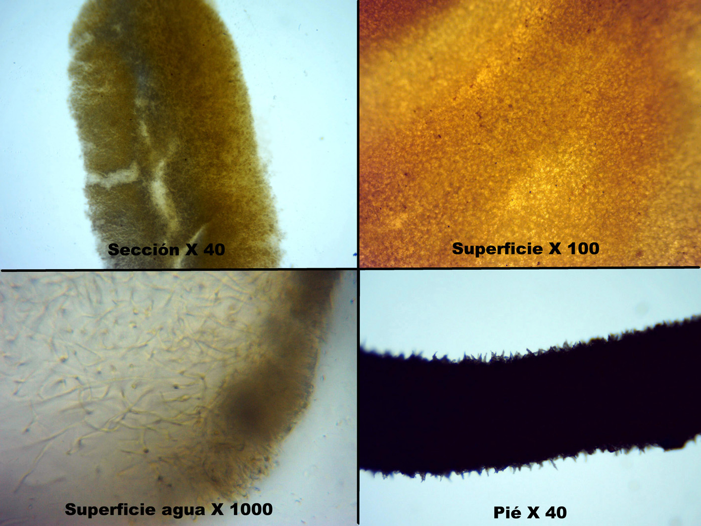 Detalle de la seción y de la superficie a varios aumentos, así como de la superficie pilosa del pié.