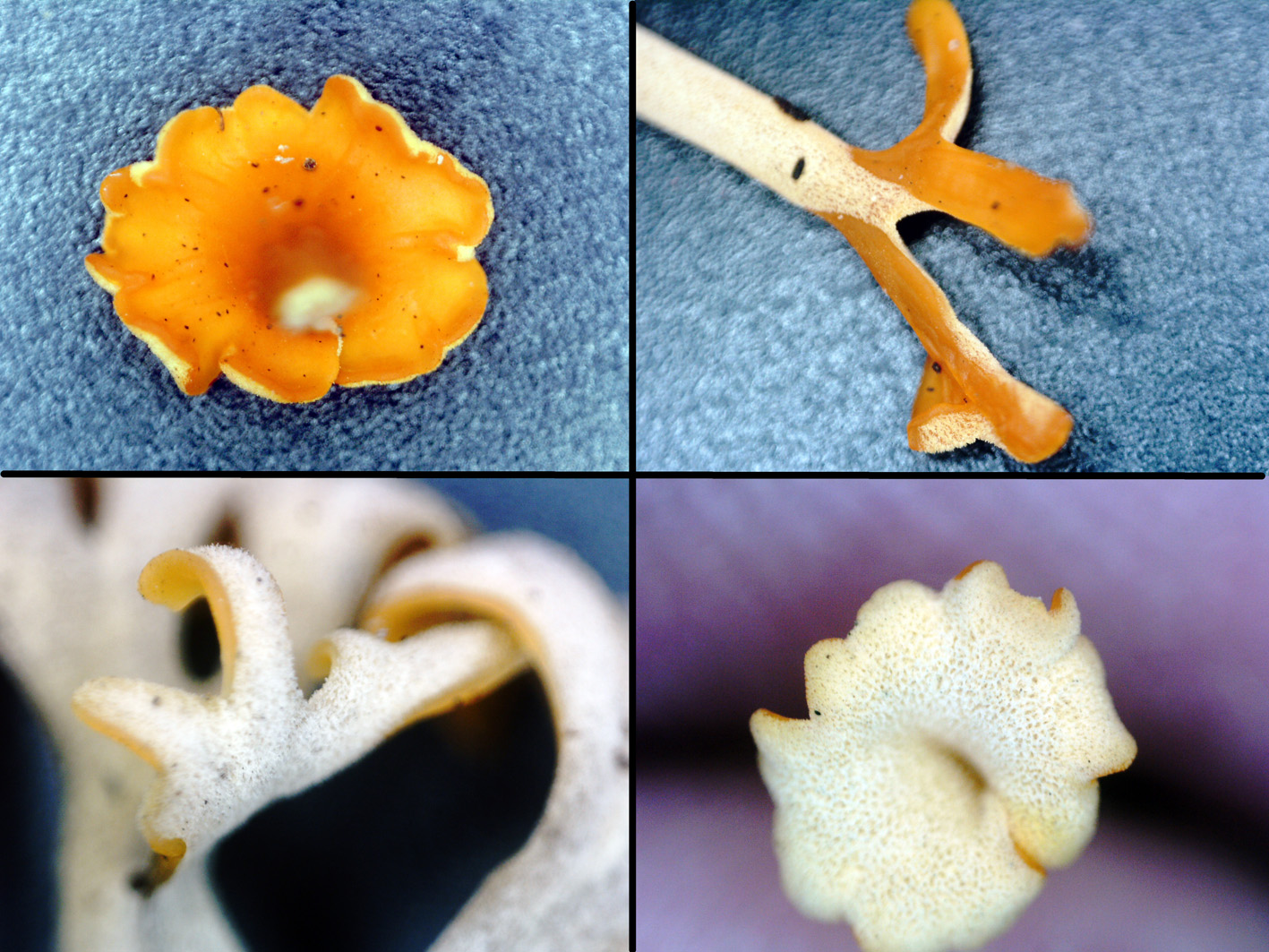 Carpóforos de hasta 2 cm . de altura brotando siempre de las grietas de los troncos, de aspecto gelatinoso y de color amarillo en estado joven aunque de consistencia dura, en estado adulto adquiere colores anaranjados y el pié blanco y piloso, de forma entre embudada y de espátula, como su nombre ya nos sugiere. En estado adulto se vuelve muy coriáceo y resistente, me fué imposible arrancarlos con los dedos y tuve que utilizar un cortauñas.