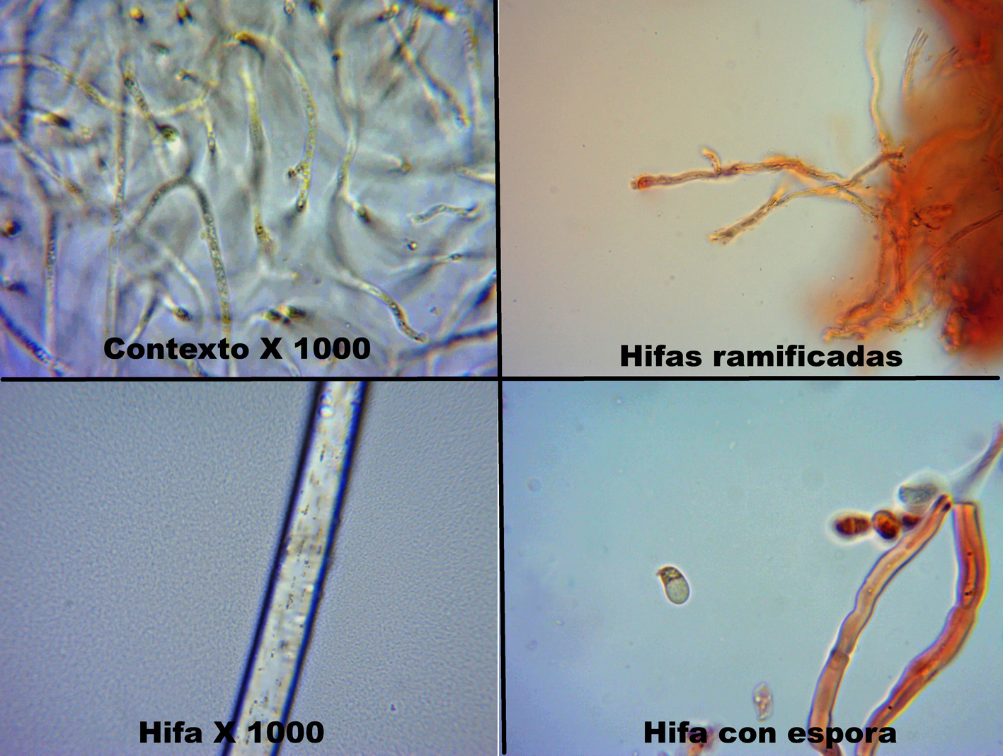 Hifas de diferentes partes, se presentan ramificadas y con ramificaciones cortas, la segunda imagen y la cuarta en Rojo congo.