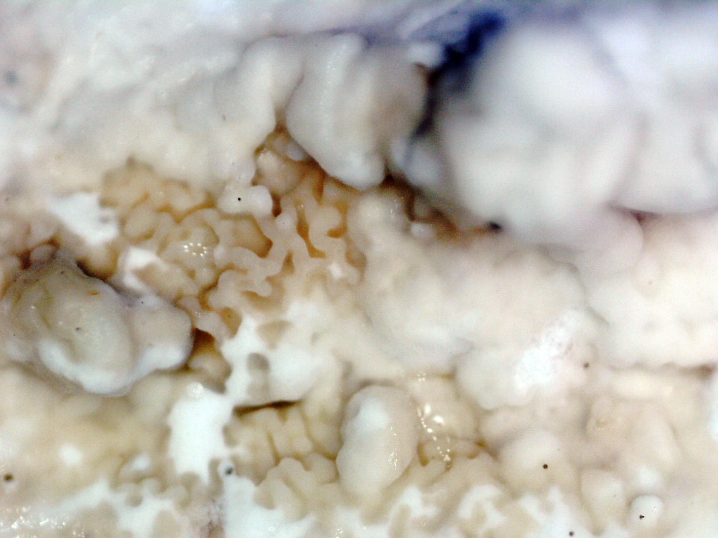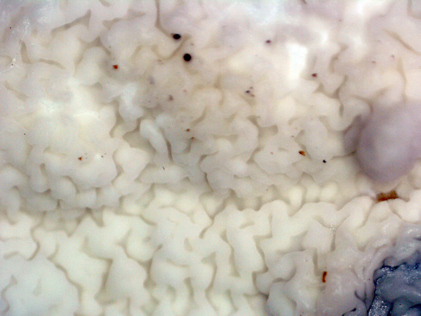 Ampliación de himenio, en estado joven ya presenta los poros angulosos y laberinticos de color blanco al principio.