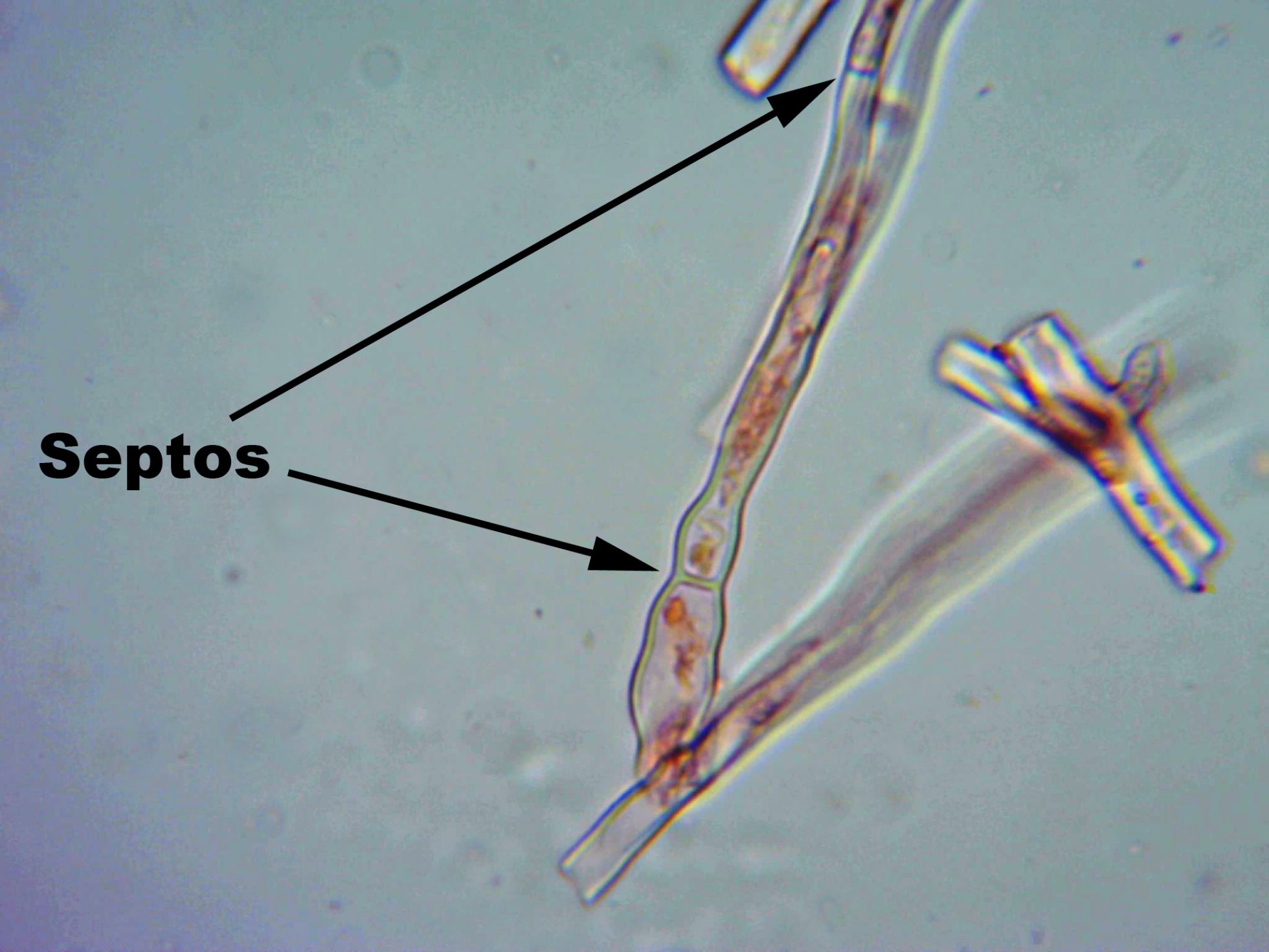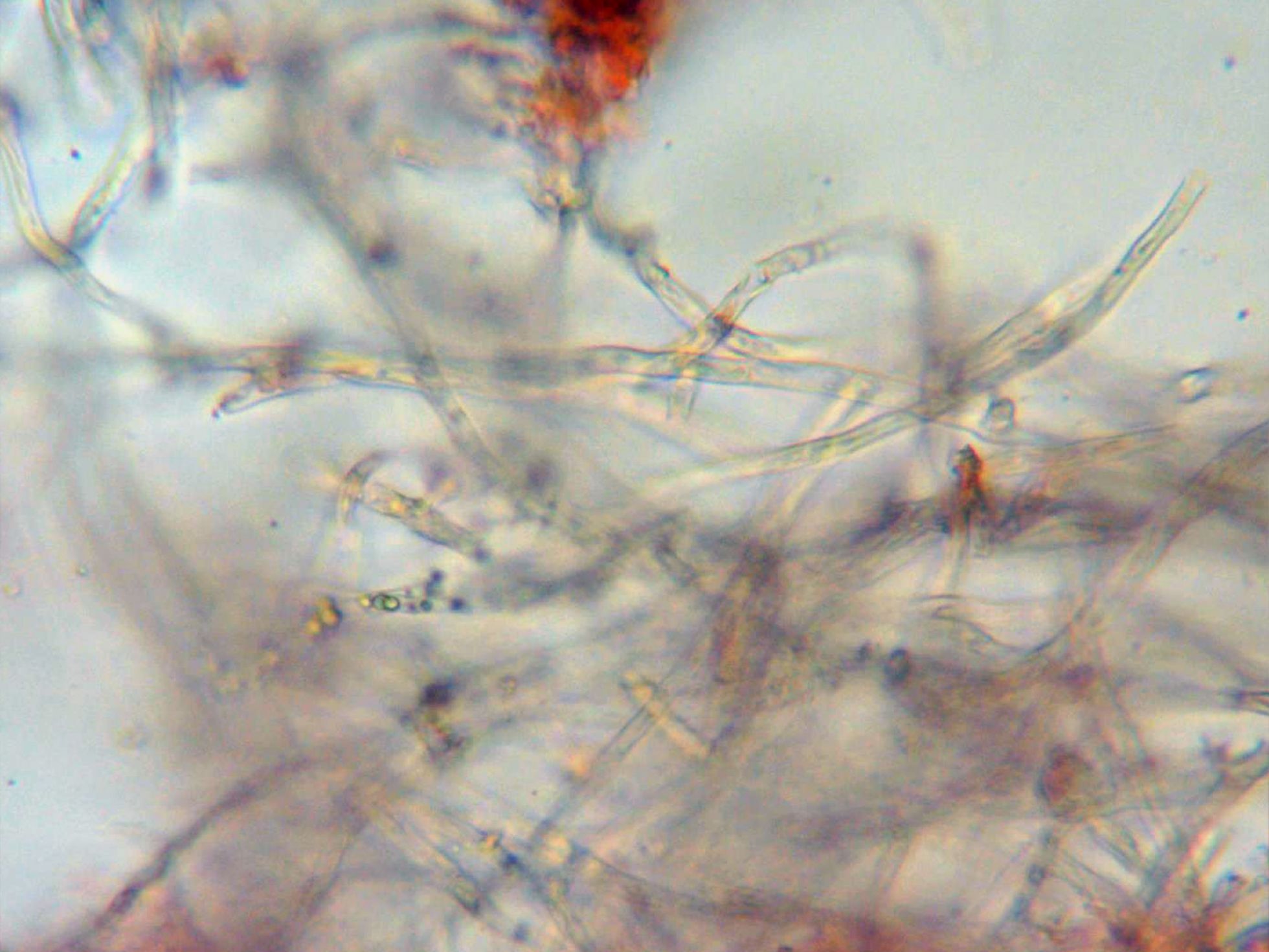 Detalle de las hifas a 400 aumentos y en Rojo congo muy diluido. De hifas septadas y en todo el análisis no pude observar fíbulas.