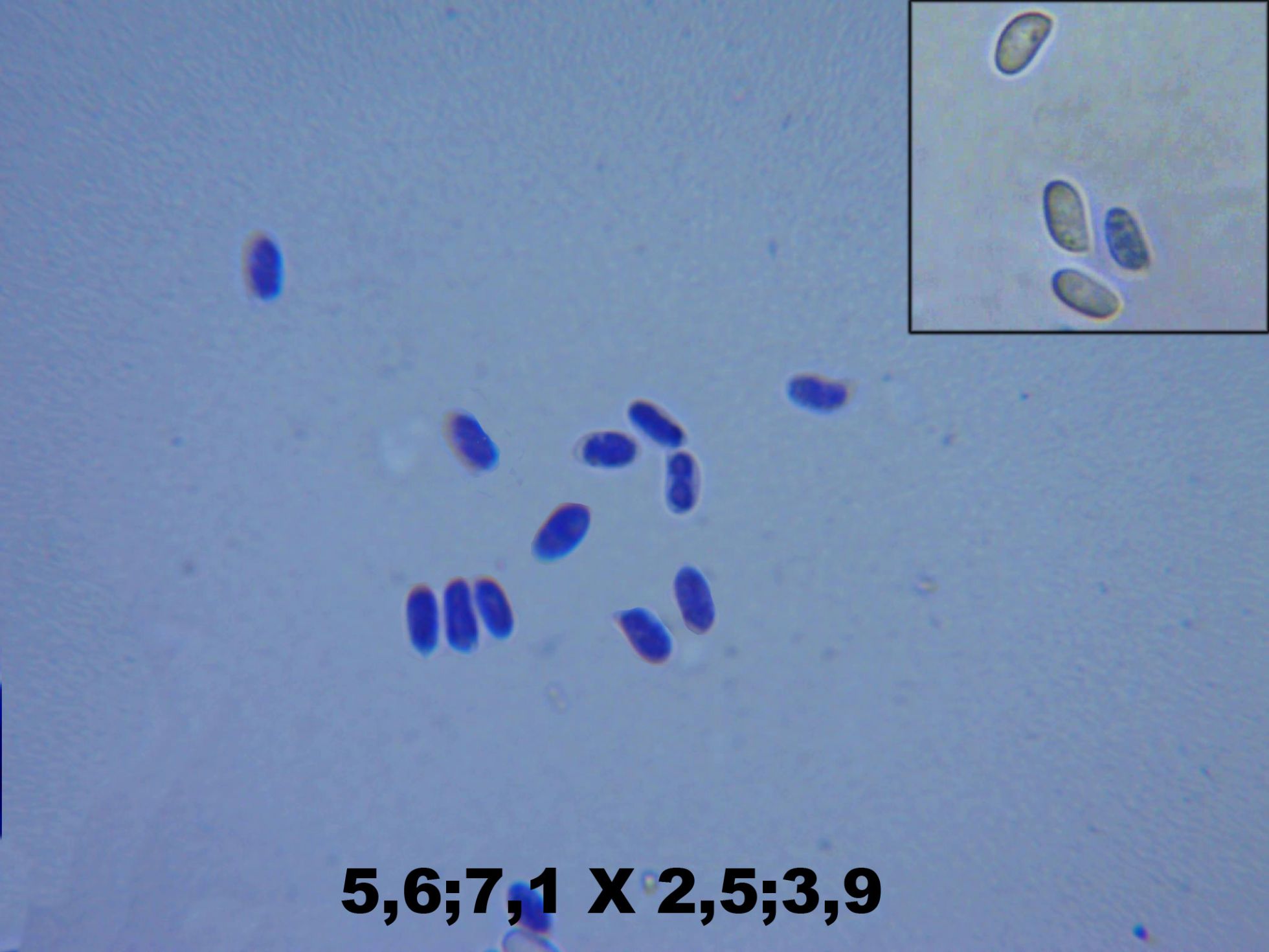 Esporas en azul de cresilo y mis mediciones, en la minatura las esporas en agua destilada.