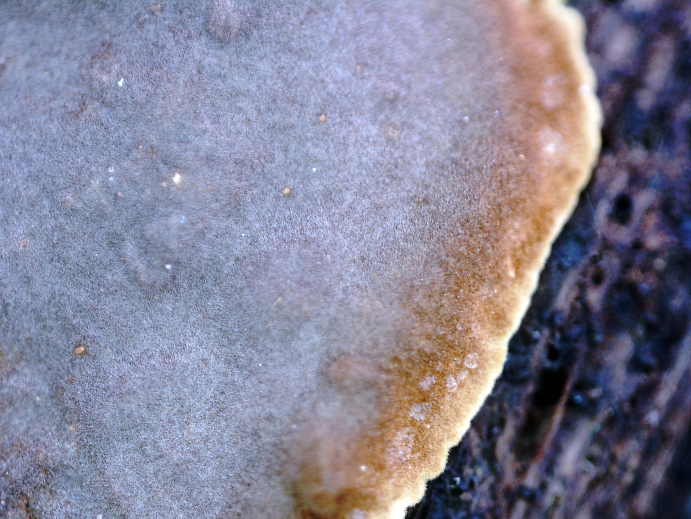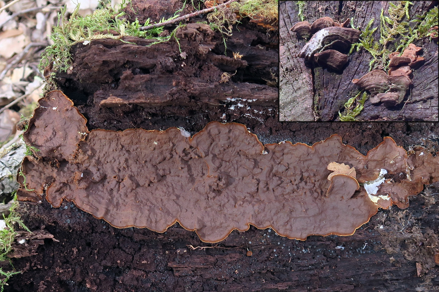 Carpóforo que crece de forma resupinada o a veces presentando un sombrero zonado. El himenio de color marrón tabaco o marrón rojizo y con el borde blanquecino, de poco grosor y bién adherido al tronco, de consistencia resistente y cartilaginosa en fresco y muy coriácea cuando está seco.