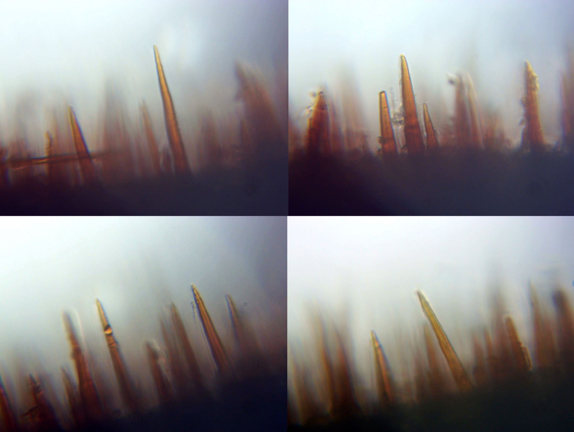 4 imágenes del Himenio con los lamprocistidios terminados en punta, la forma de estos se denomina seta y es propia de la famila Hymenochaeteaceae.
