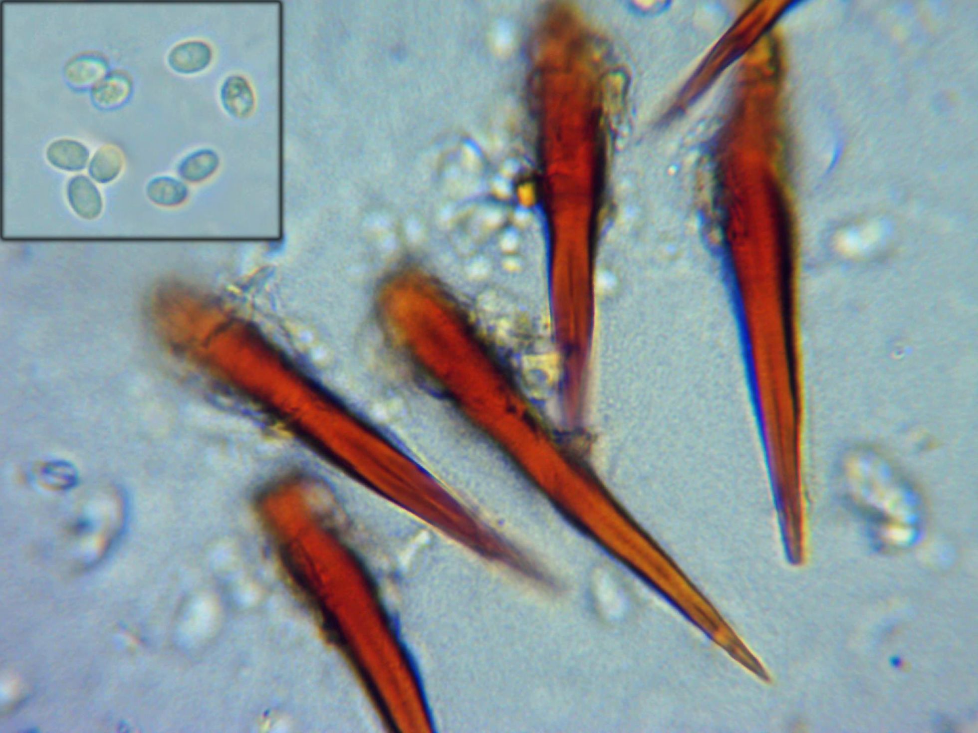 Imagen de las setas (lamprocistidios) a 1000 aumentos , el tamaño de las de la imagen entre 50 y 62 micras de largo.