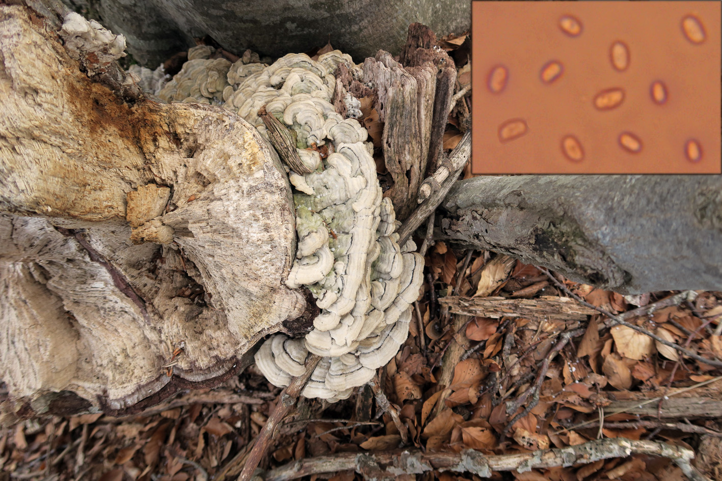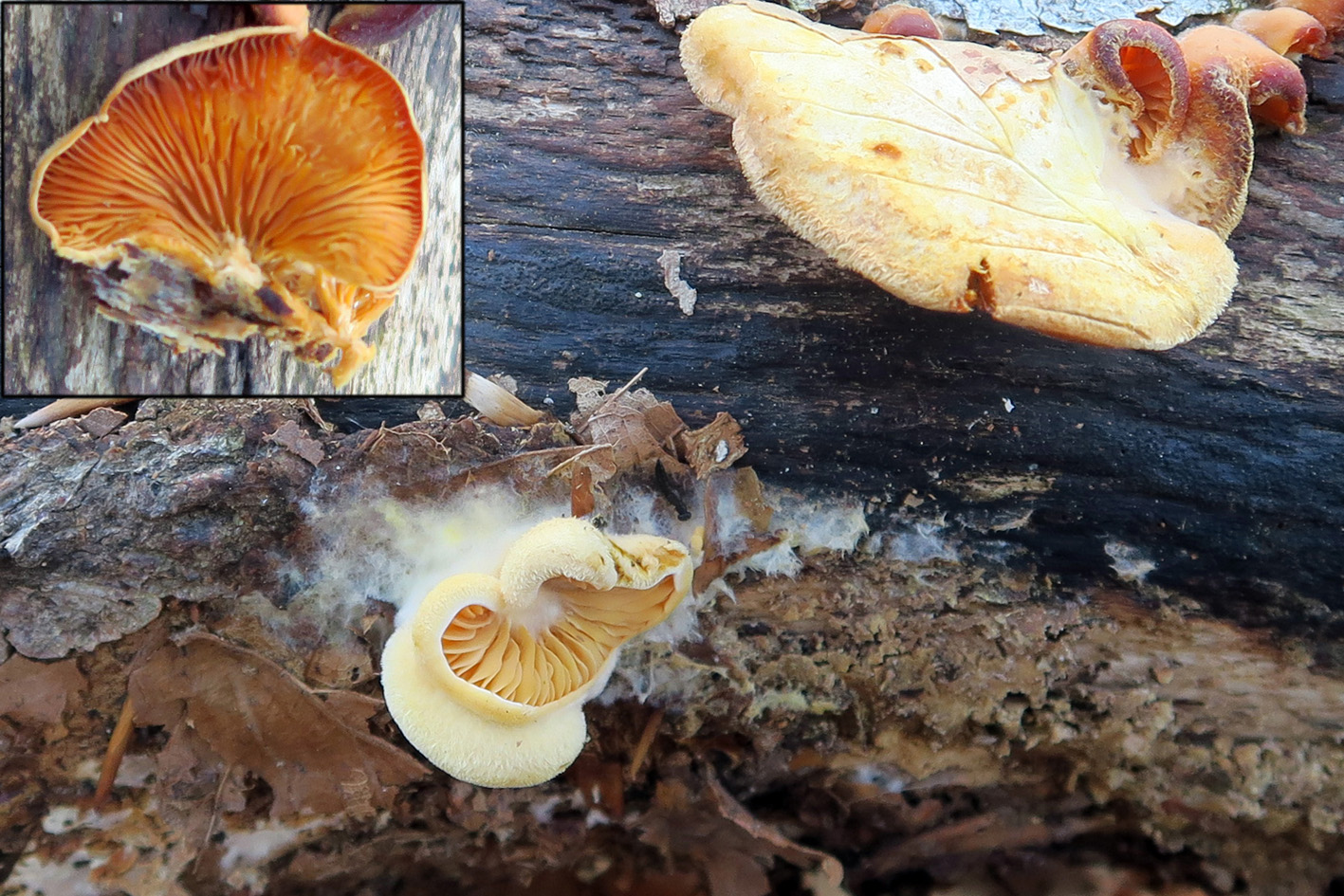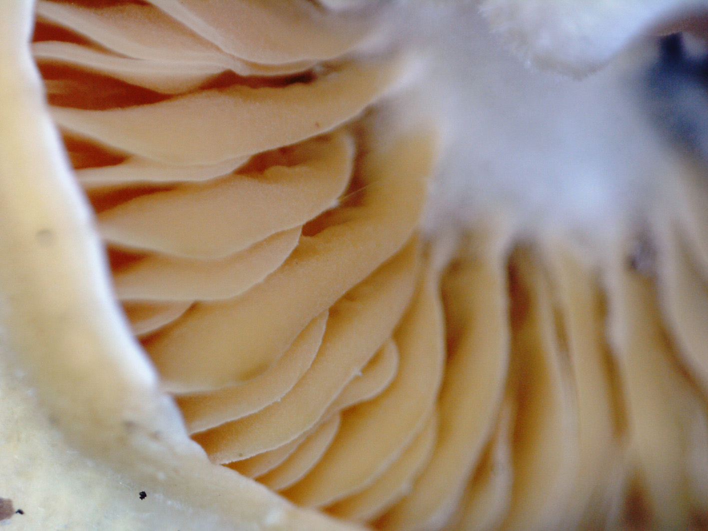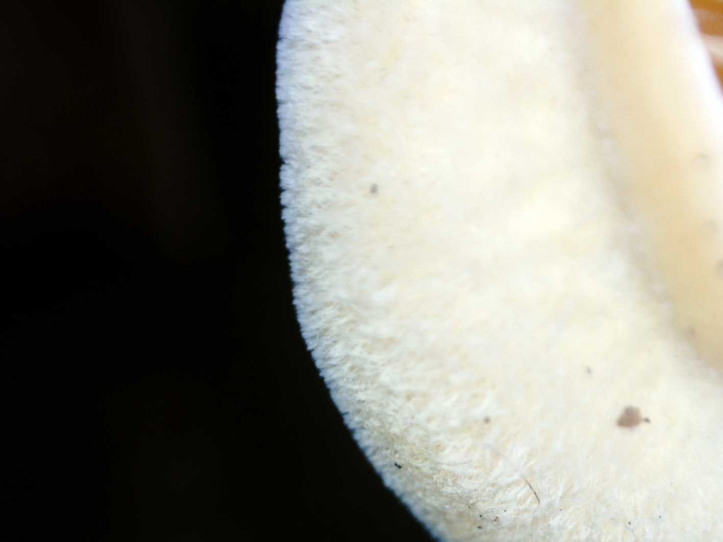 Láminas ocráceas de uno de los ejemplares jóvenes, en lugar del pié en la unión con el tronco huésped presenta restos de micelio blanco, visibles en la imagen.