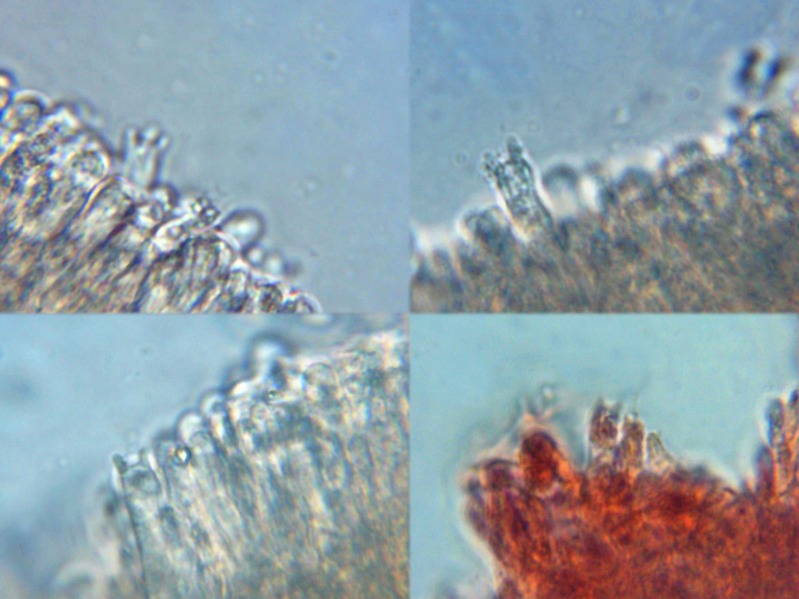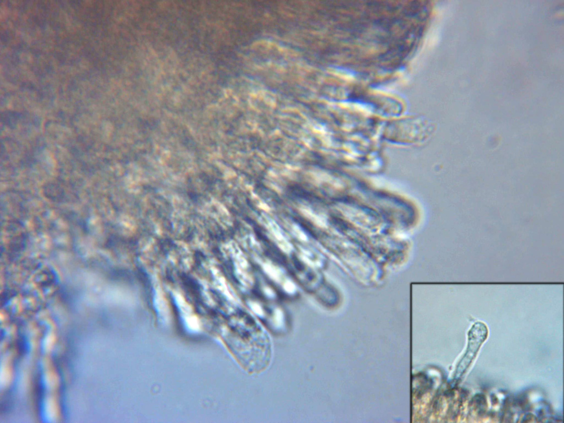 Cistidios del borde laminar (Queilocistidios) en agua destilada, en la miniatura un Pleurocistidio.