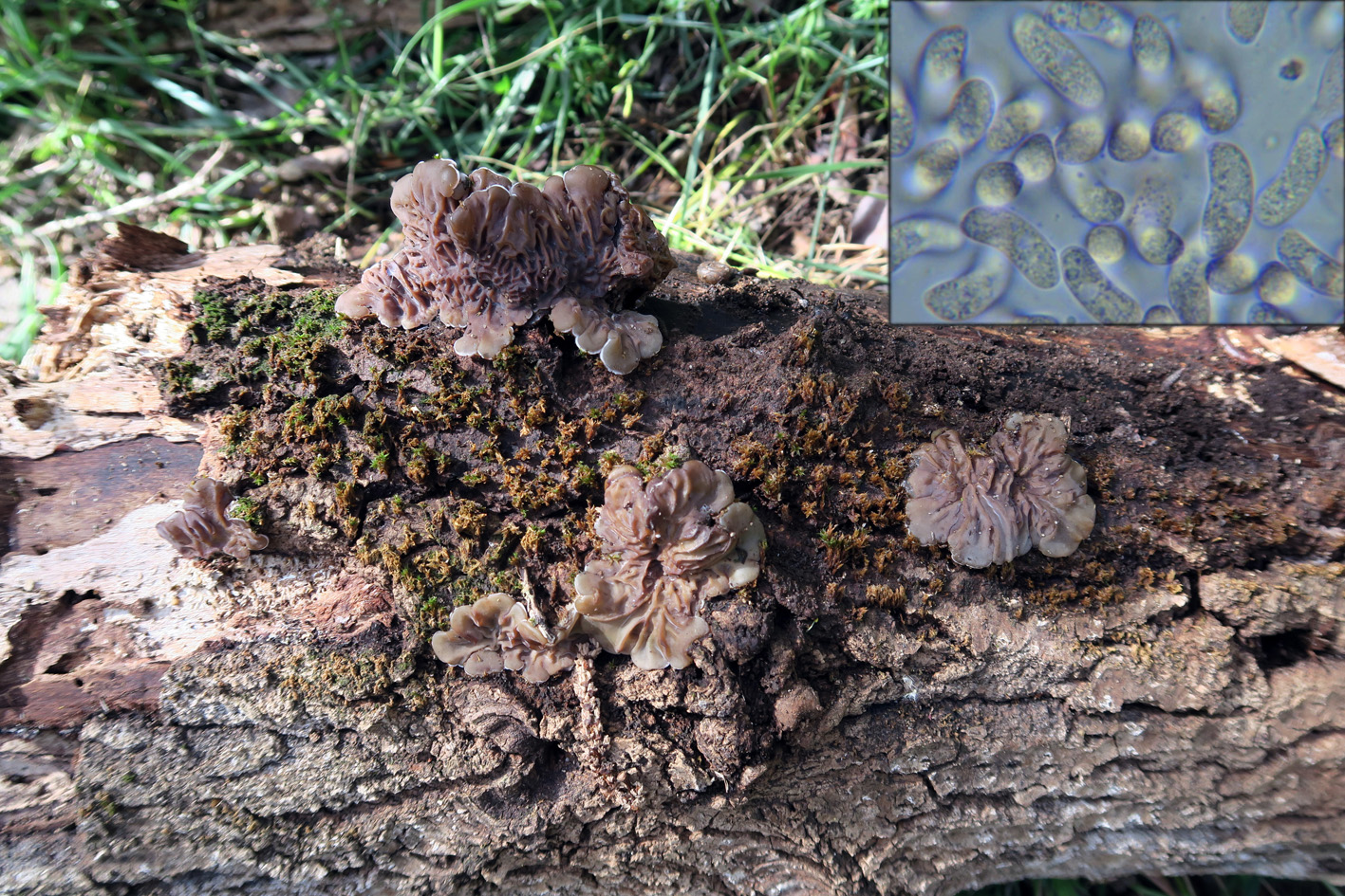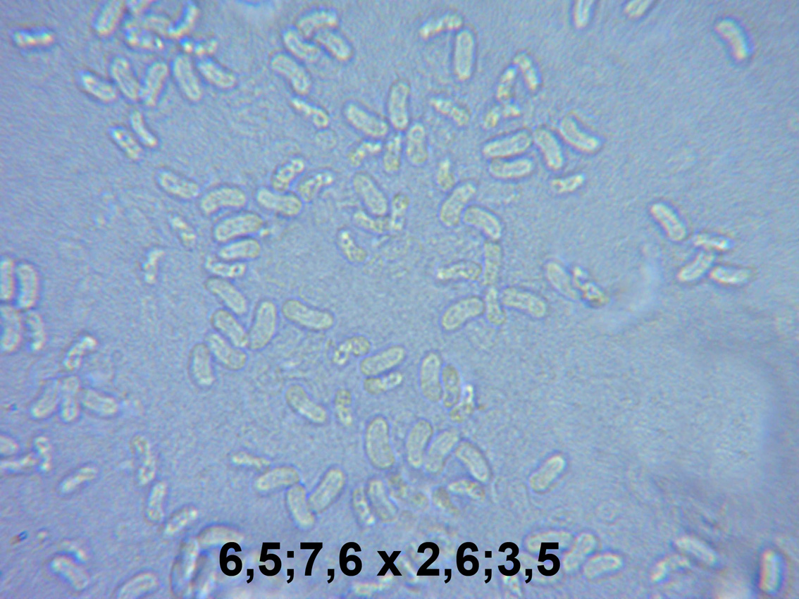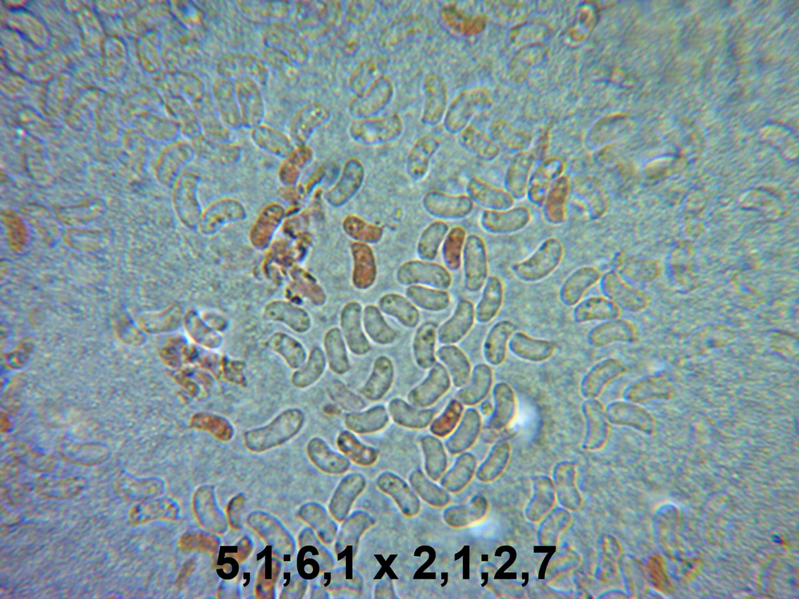 Esporas en agua destilada y en rojo congo diluido a 1000 aumentos y el resultado de mis mediciones. En la bibliografía de la especie hay una gran controversia en cuanto a las medidas que deben presentar, creando confusión al respecto, algunos autores sitúan su longitud entre 4,5 y 6 micras, bastante por debajo de mis mediciones, en cambio otros autores como Michael Kuo sitúan su longitud entre 5 y 8 micras, encajando perfectamente con mi propuesta y con mis mediciones. Esporas elípticas y con forma de riñón, subhialinas, de pared fina y prácticamente hialinas en KOH.