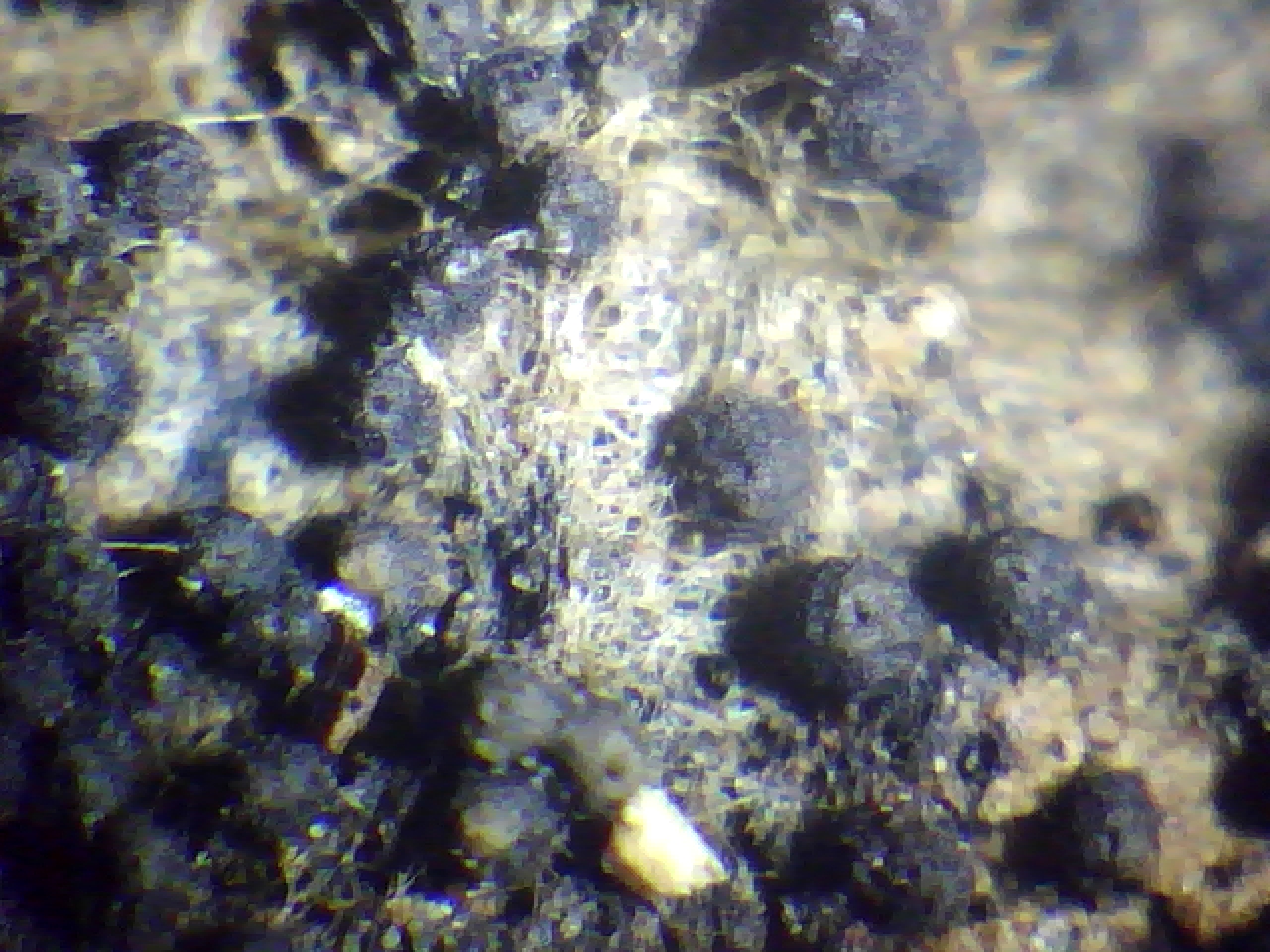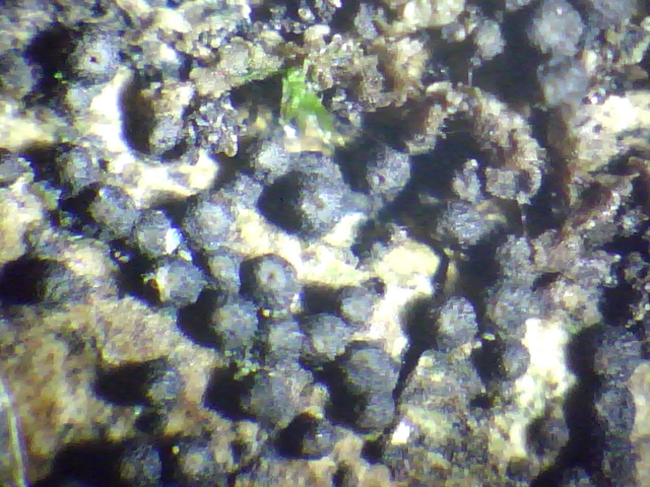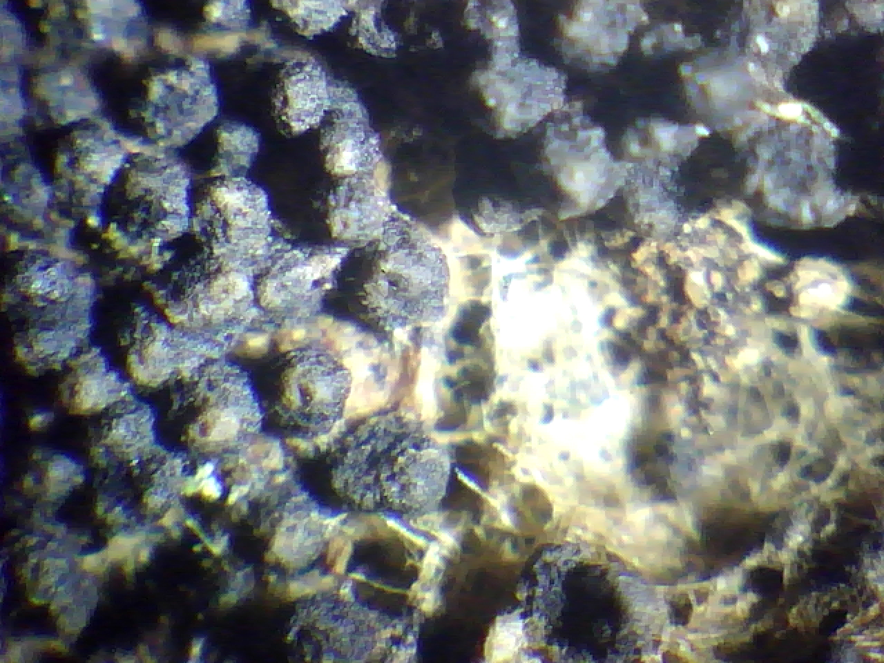 Cada uno de estos estromas no creo que superasen 1 mm de color negro o gris oscuro. En su parte superior poseen unos pequeños orificios rodeado de lo que parece ser de consistencia algodonosa y que se supone que desprenderán las esporas