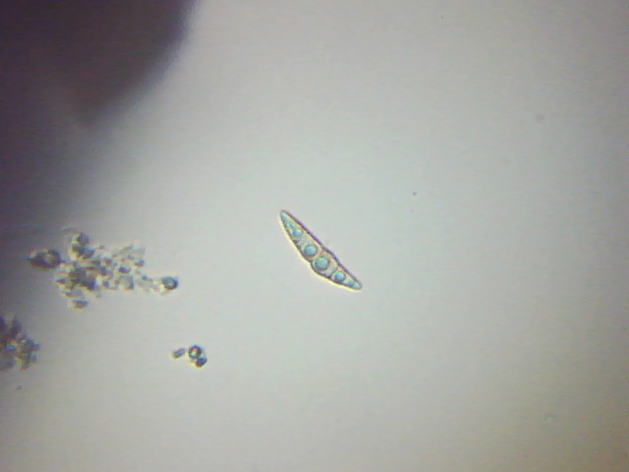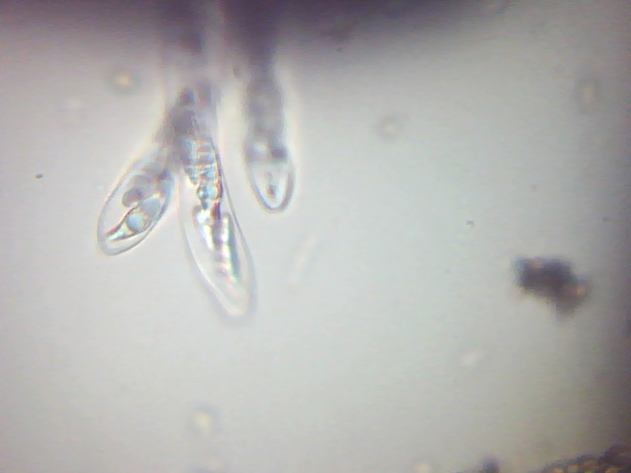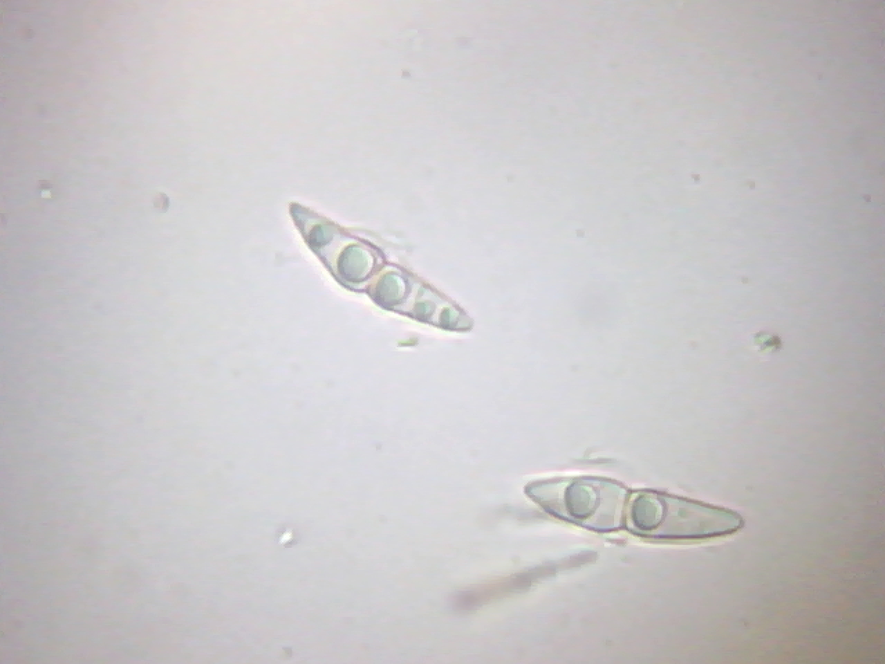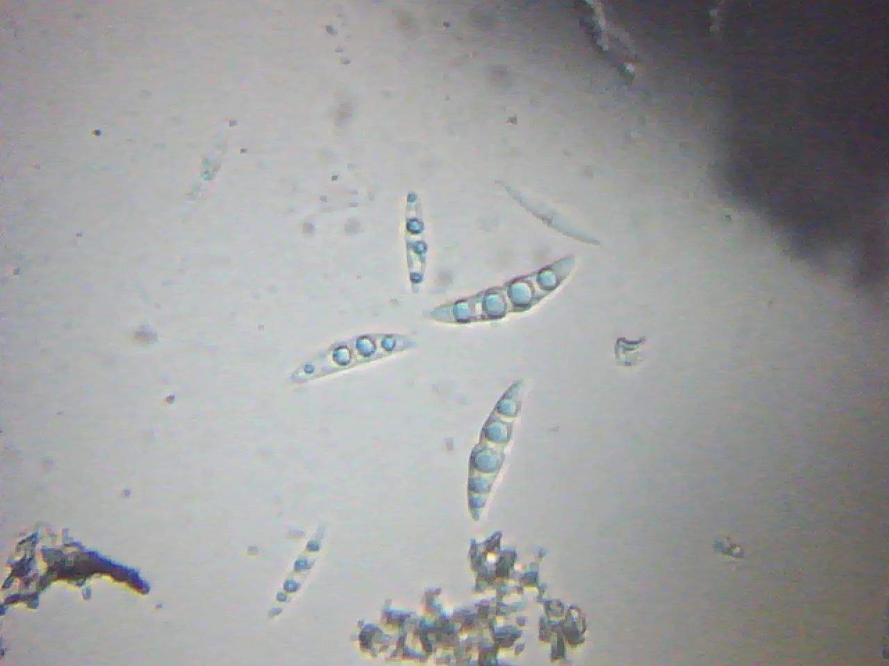 Espora a 400x estrechandose en el centro, En los extremos acaban en punta (Con aspecto de croissant)