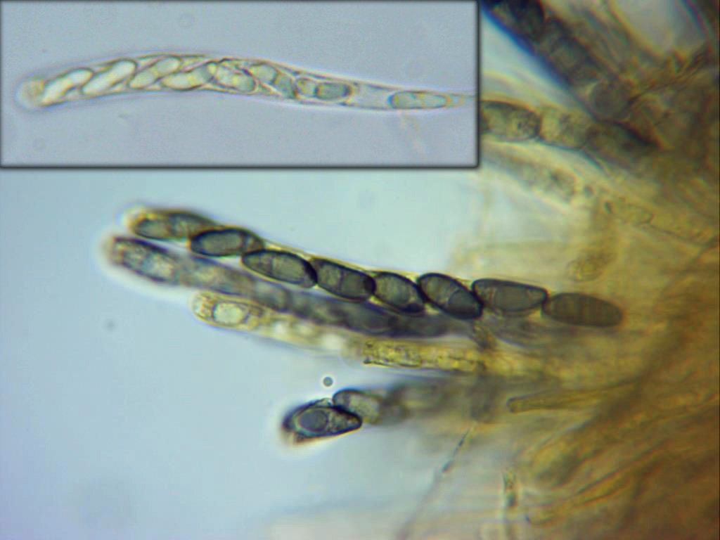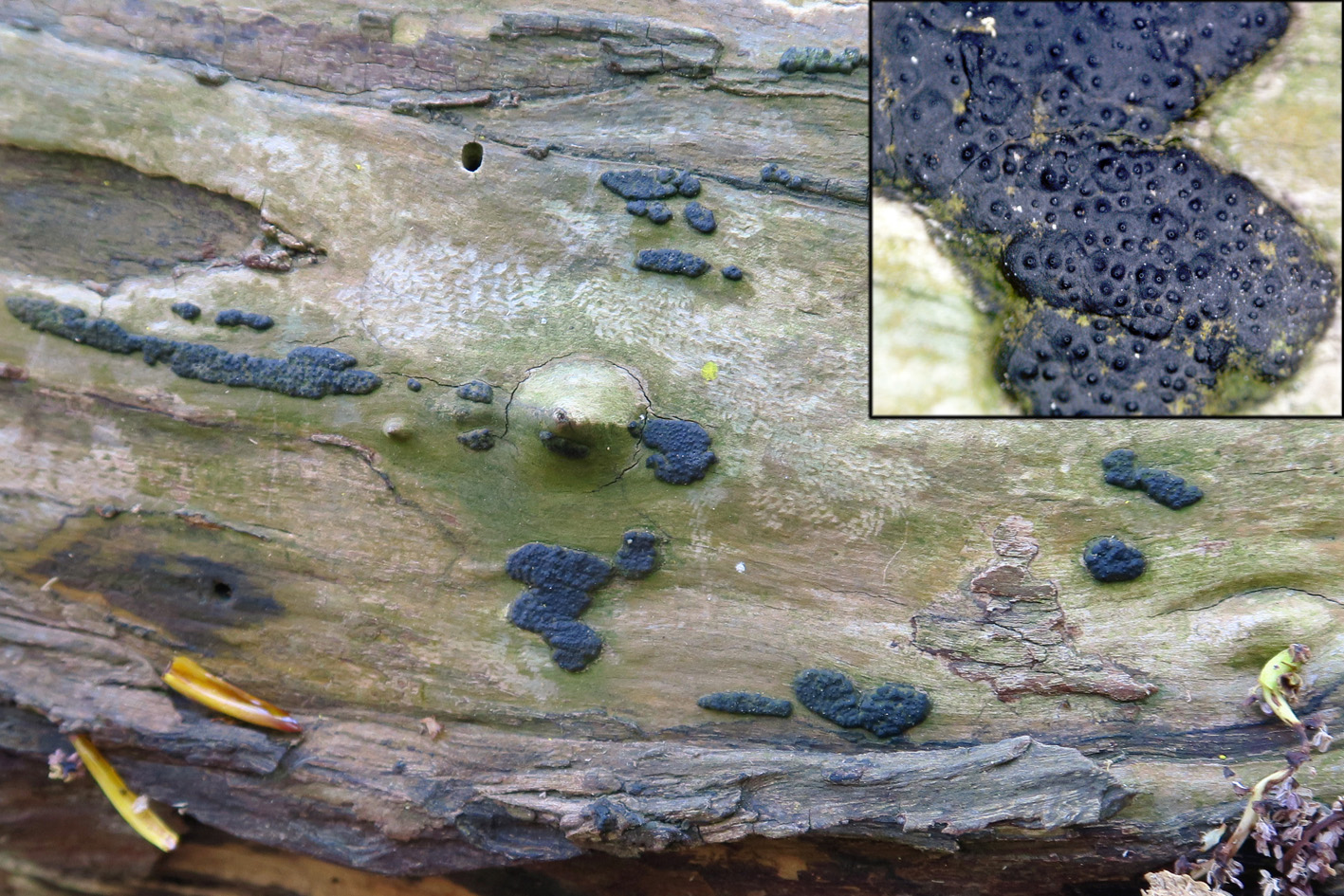 Especie en el tronco huésped, en la ampliación de la miniatura se aprecian los ostiolos en su superficie.