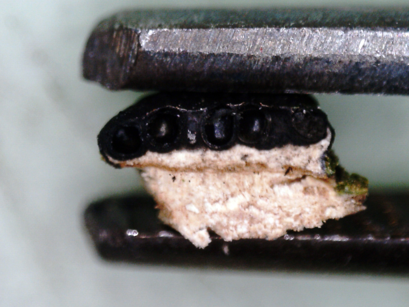 Detalle de la sección, se aprecian los peritecios, que le confieren un aspecto cavernoso.