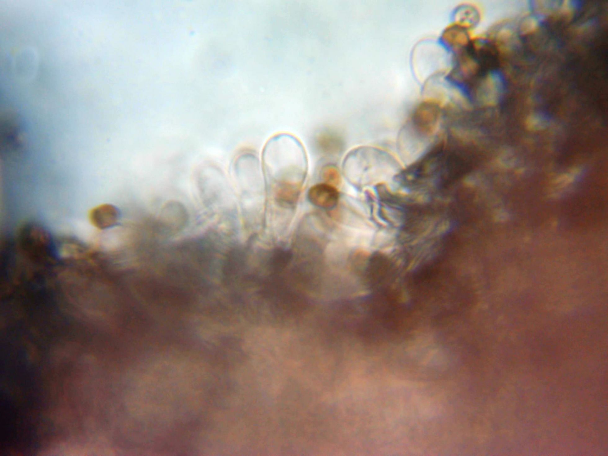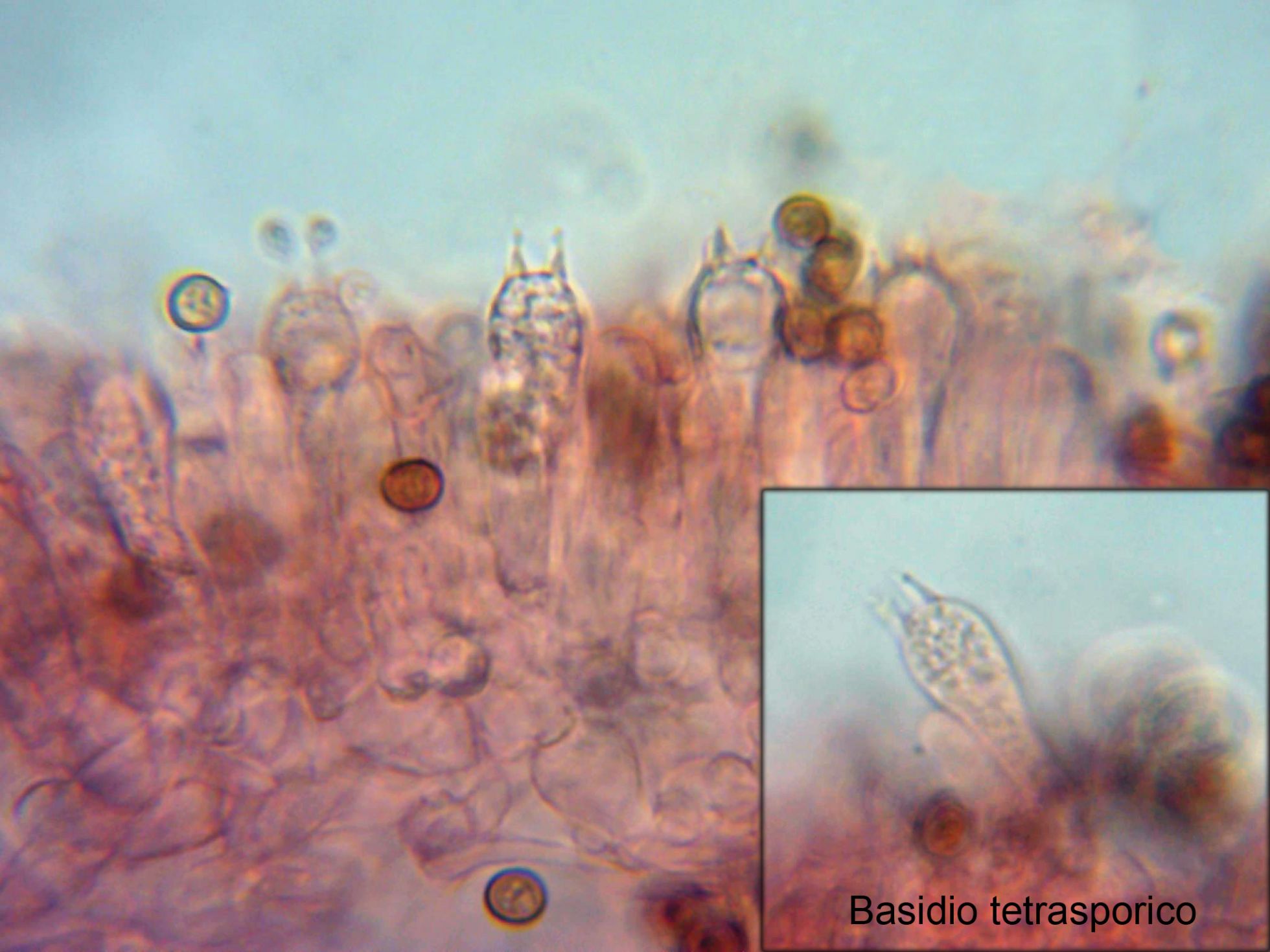 Imagen de los basidios, estos son tetraspóricos, se aprecia bien este detalle en la imagen de la miniatura, de 20 a 28 micras de largo en mis mediciones.