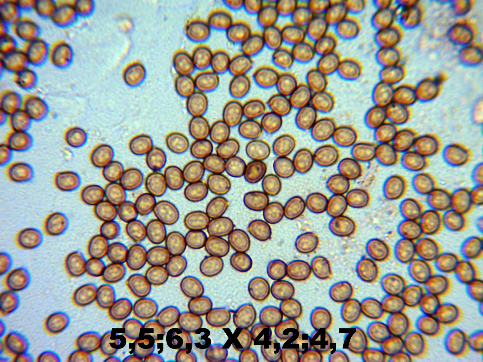 Imagen de las esporas y sus medidas, su pequeño tamaño en comparación con otros Agaricus parecidos hace que encaje perfectamente con mi propuesta. Concuerda perfectamente con la bibliografía de la especie.