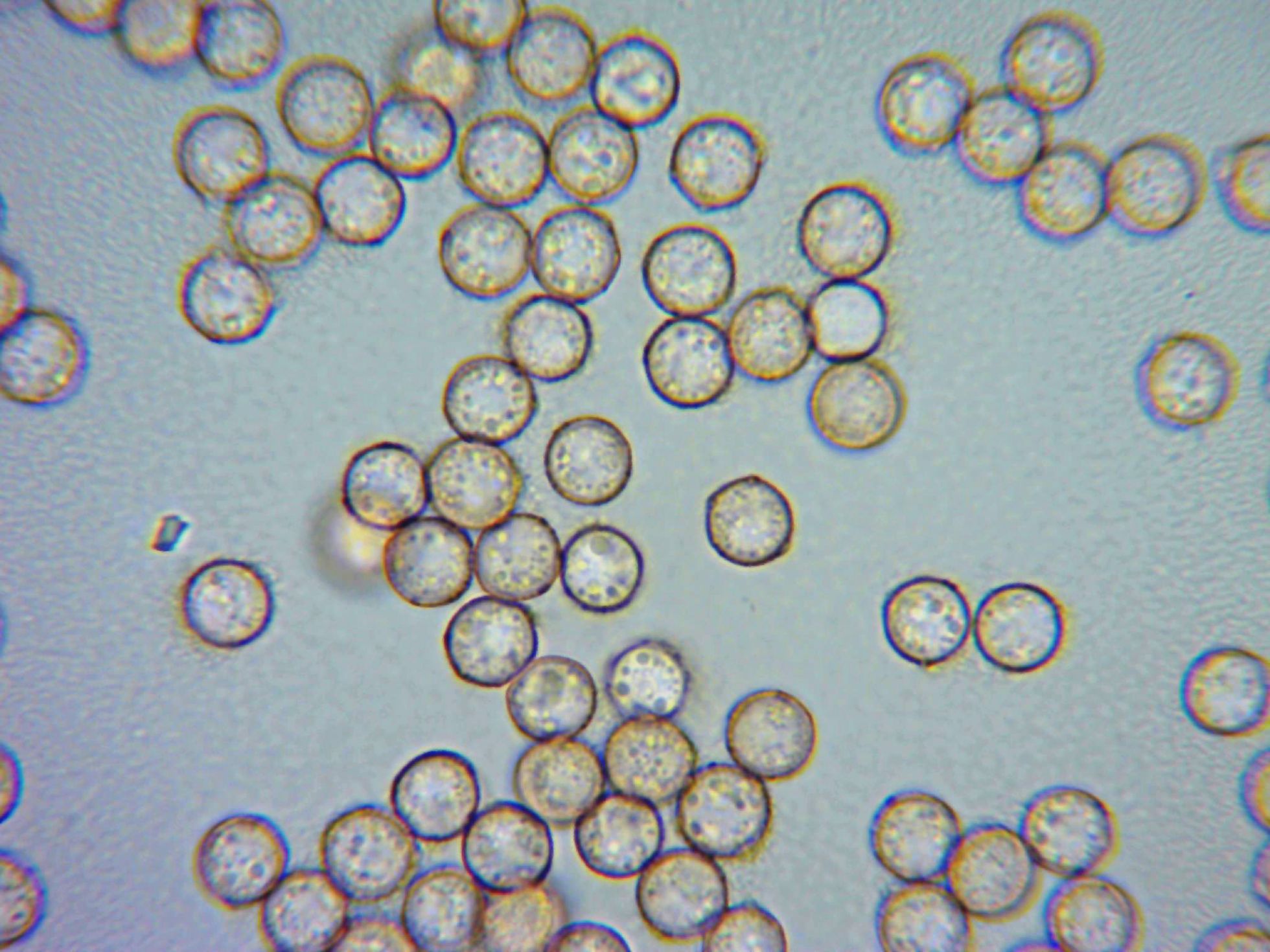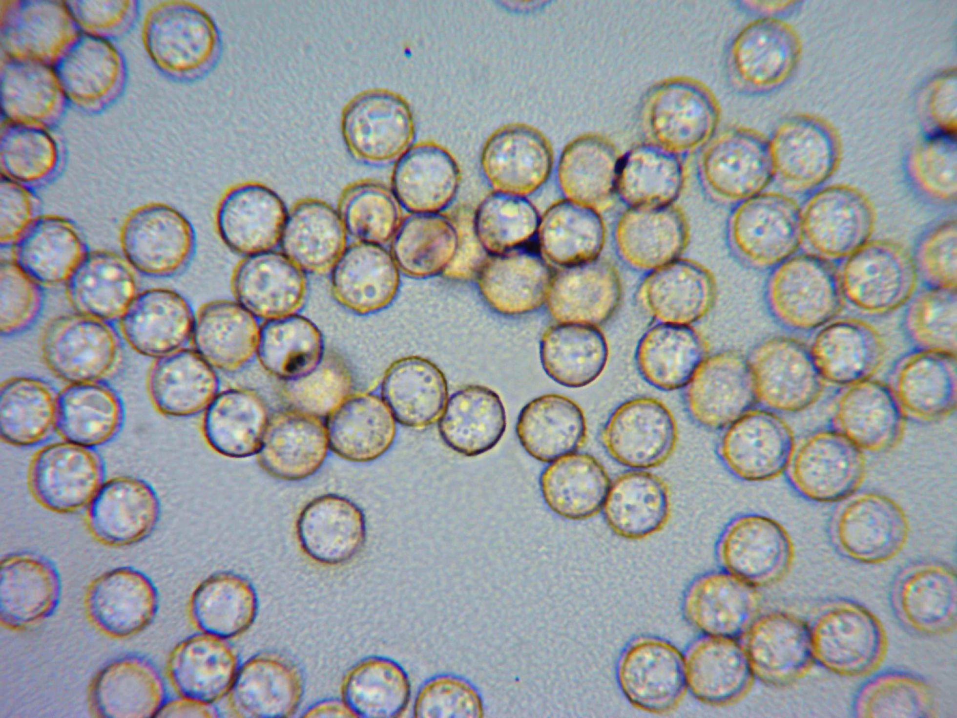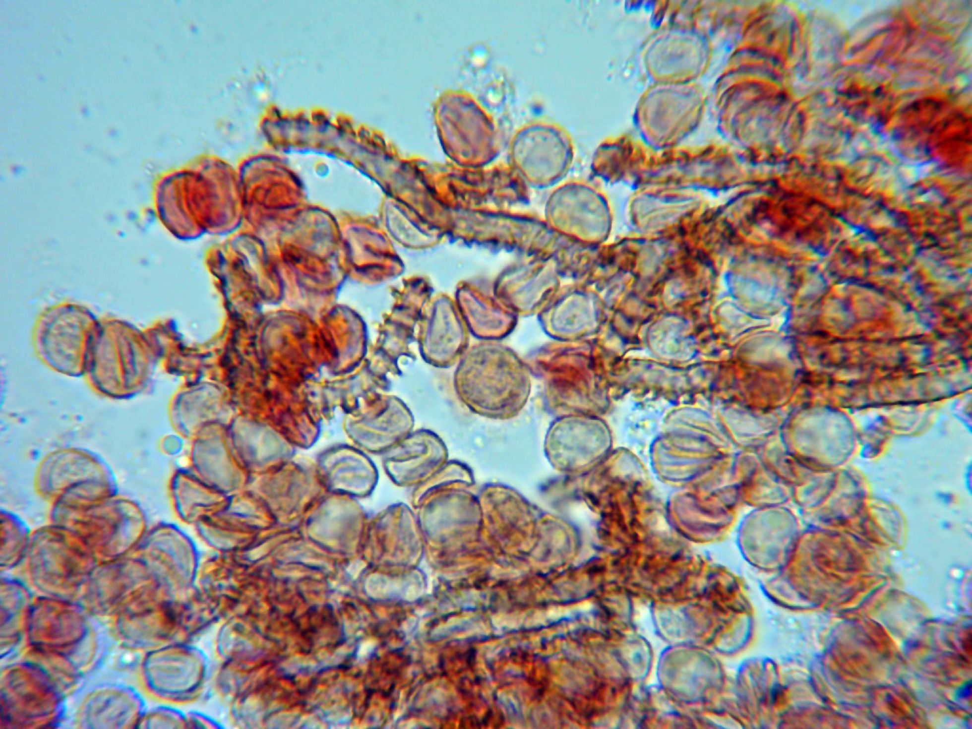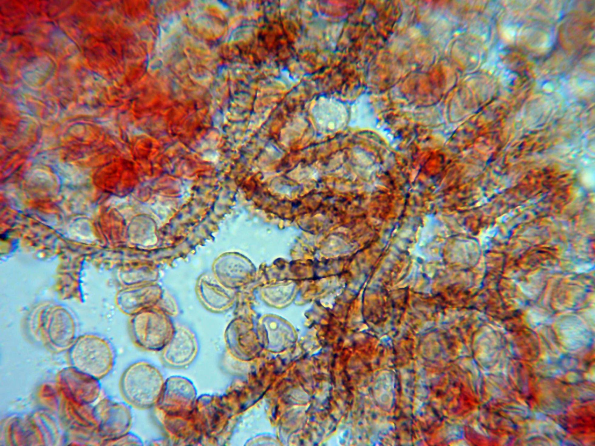 Un par de imágenes de las esporas. en masa de color ladrillo rojo, en el micro esféricas de aspecto ligeramente verrucoso y en mis mediciones de entre 7,1 y 8,9 micras.