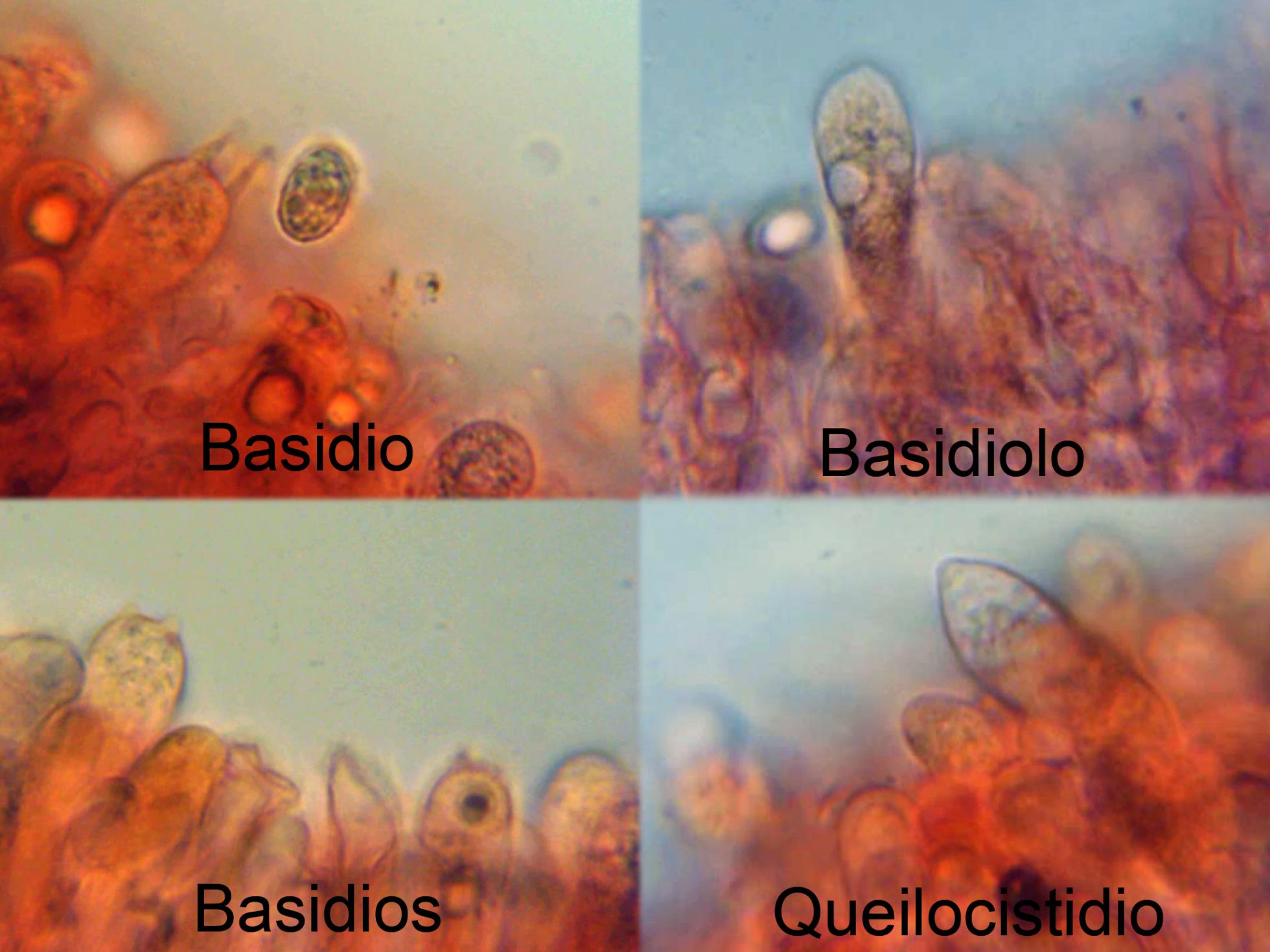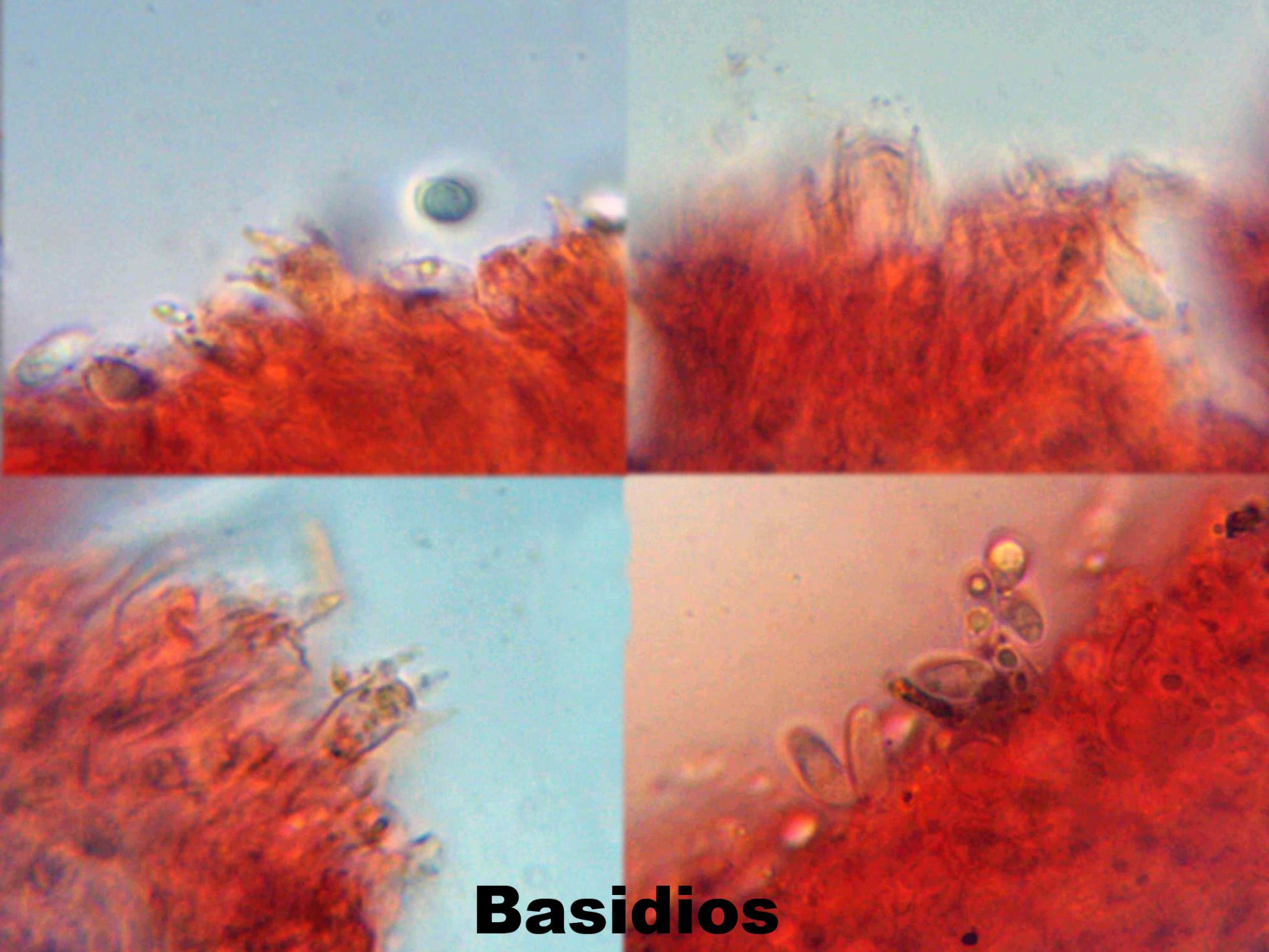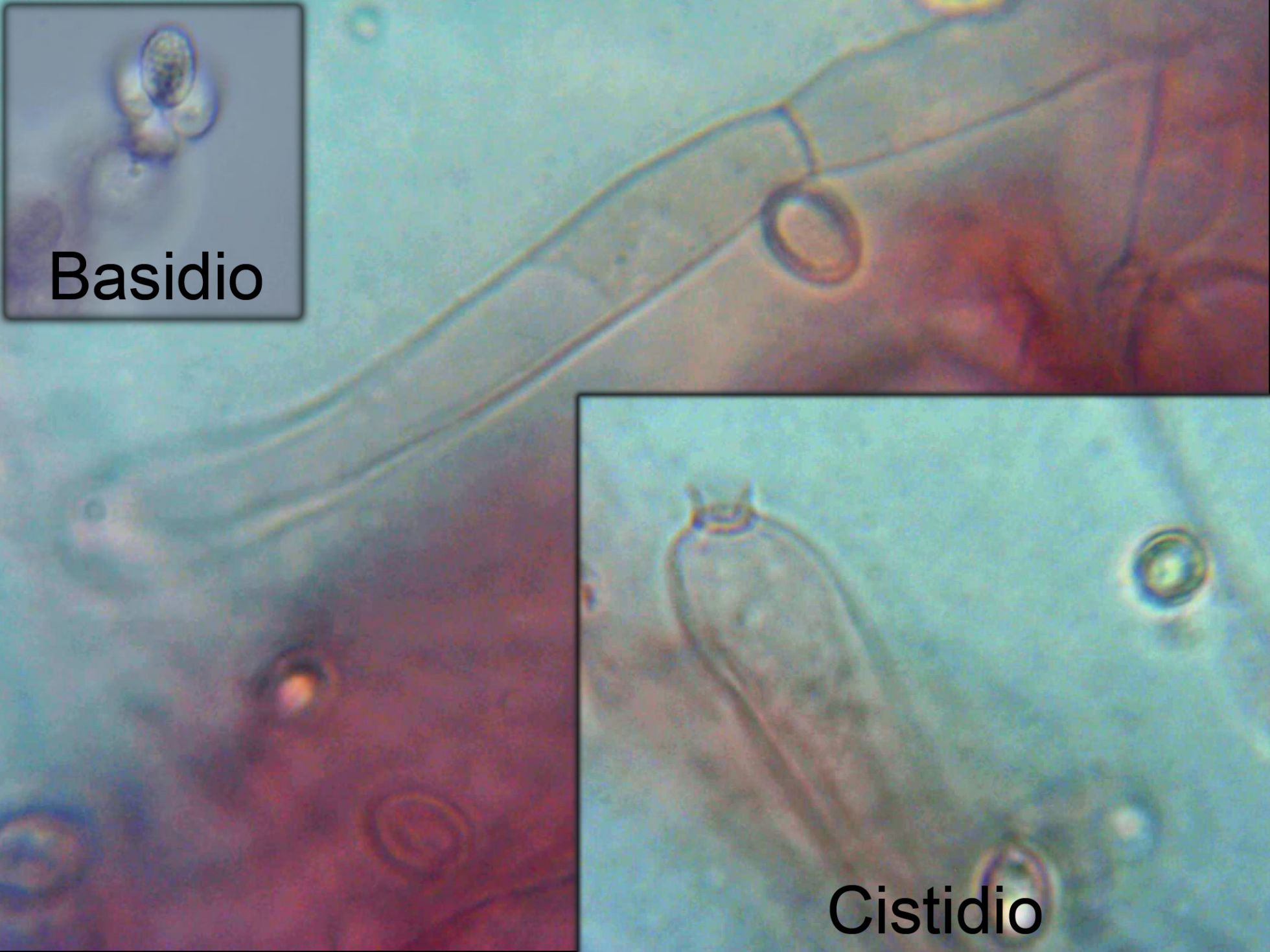 Imagen con un basidio tetrasporico y los cistidios de gran tamaño.