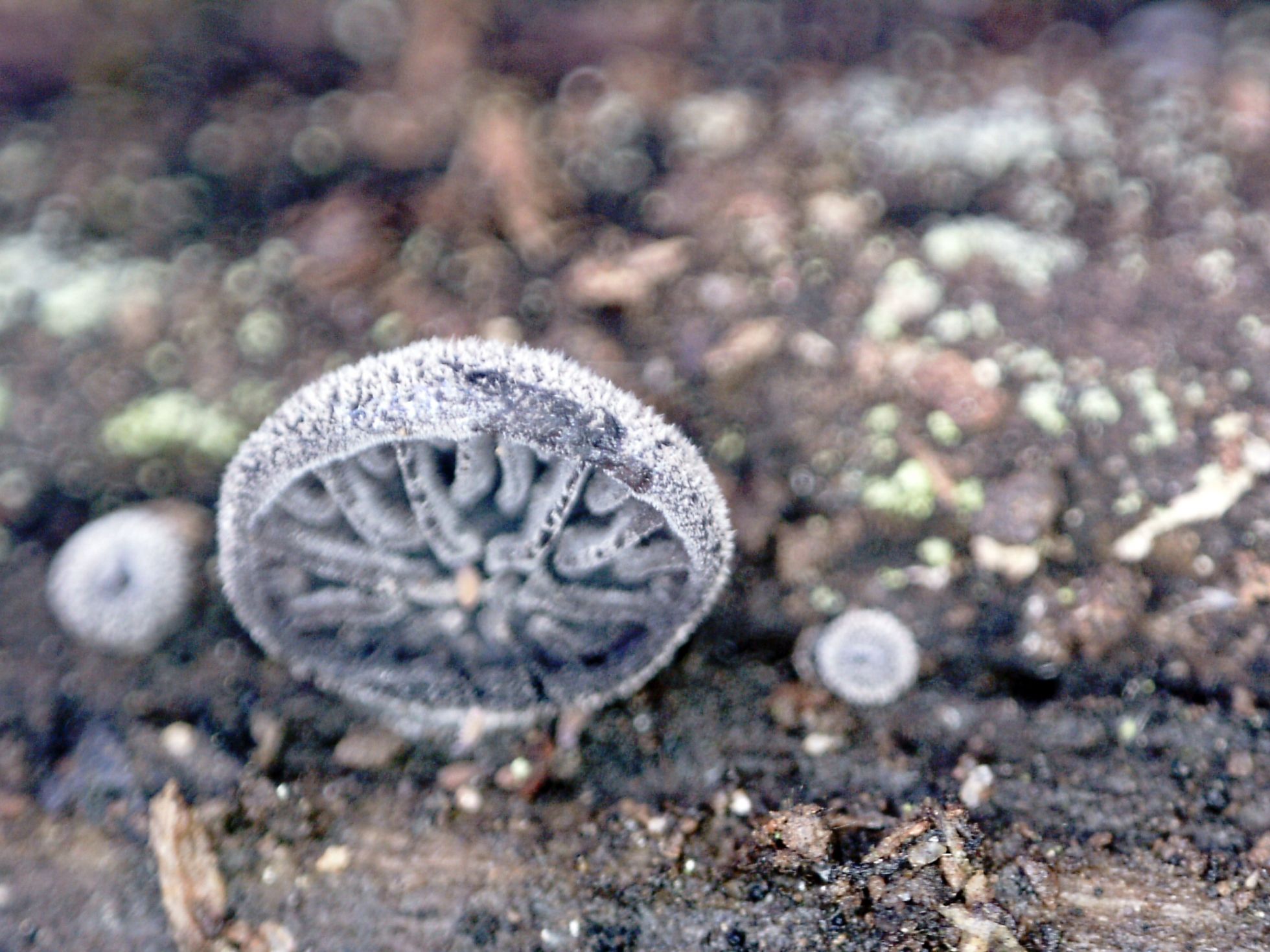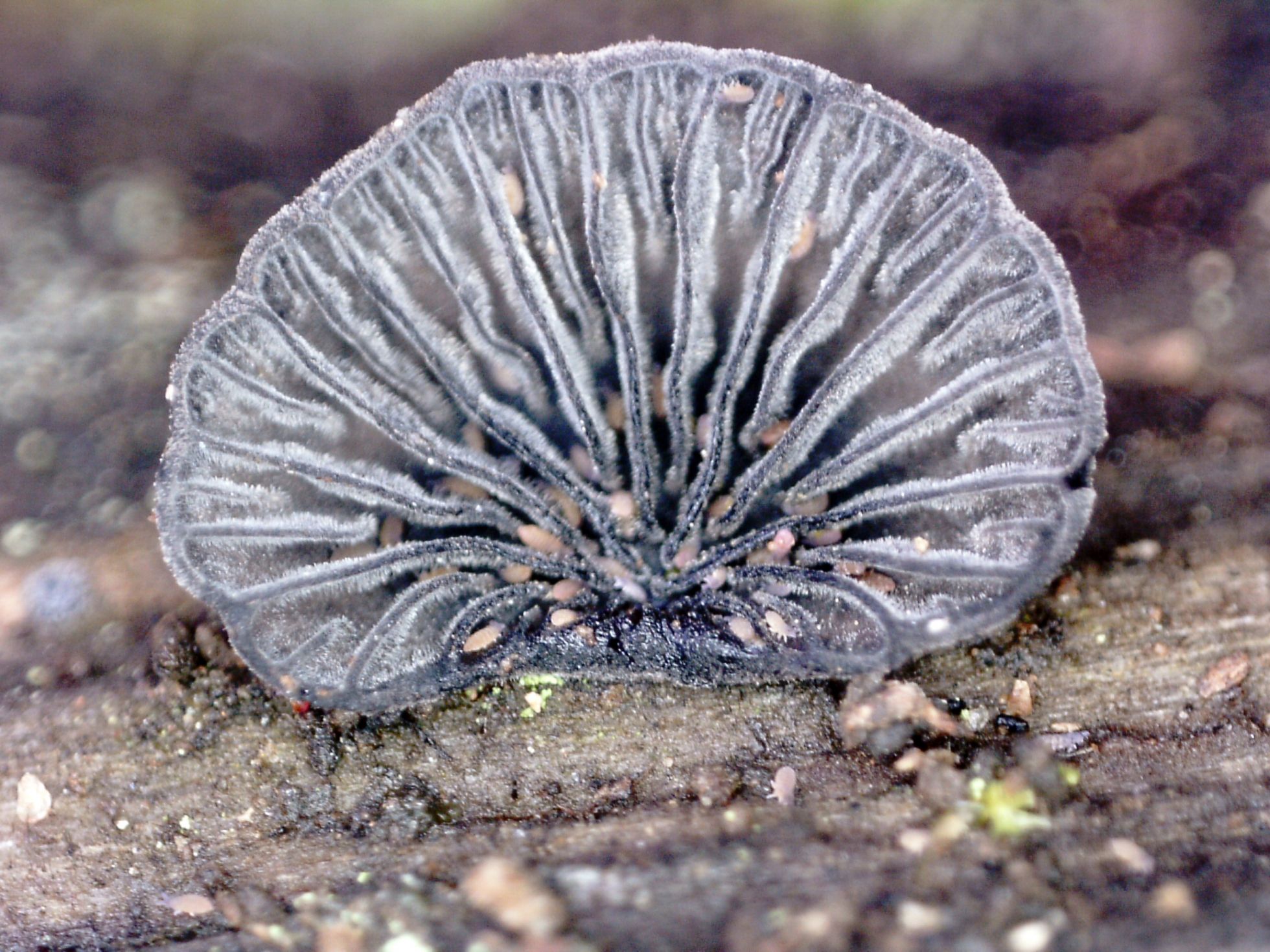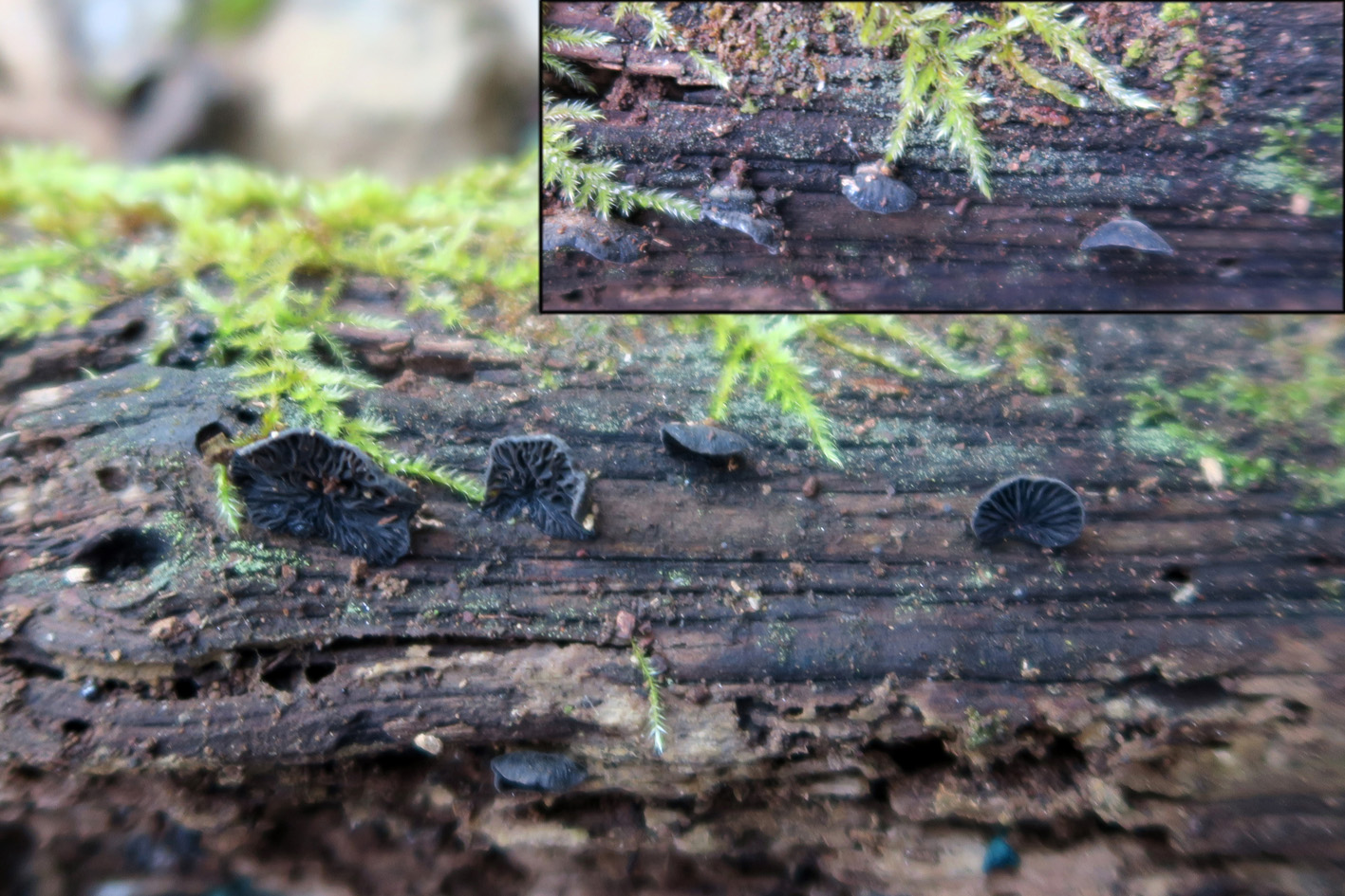 Carpóforos de pequeño tamaño, de apenas dos cm. la mayor, sombrero de color grisáceo azul oscuro, más claro en el borde del sombrero, con forma de abanico y de cutícula como gelatinosa y elástica. Himenio con láminas separadas y abundantes lamélulas concoloras con el sombrero y tonos más anaranjados y claros en los ejemplares