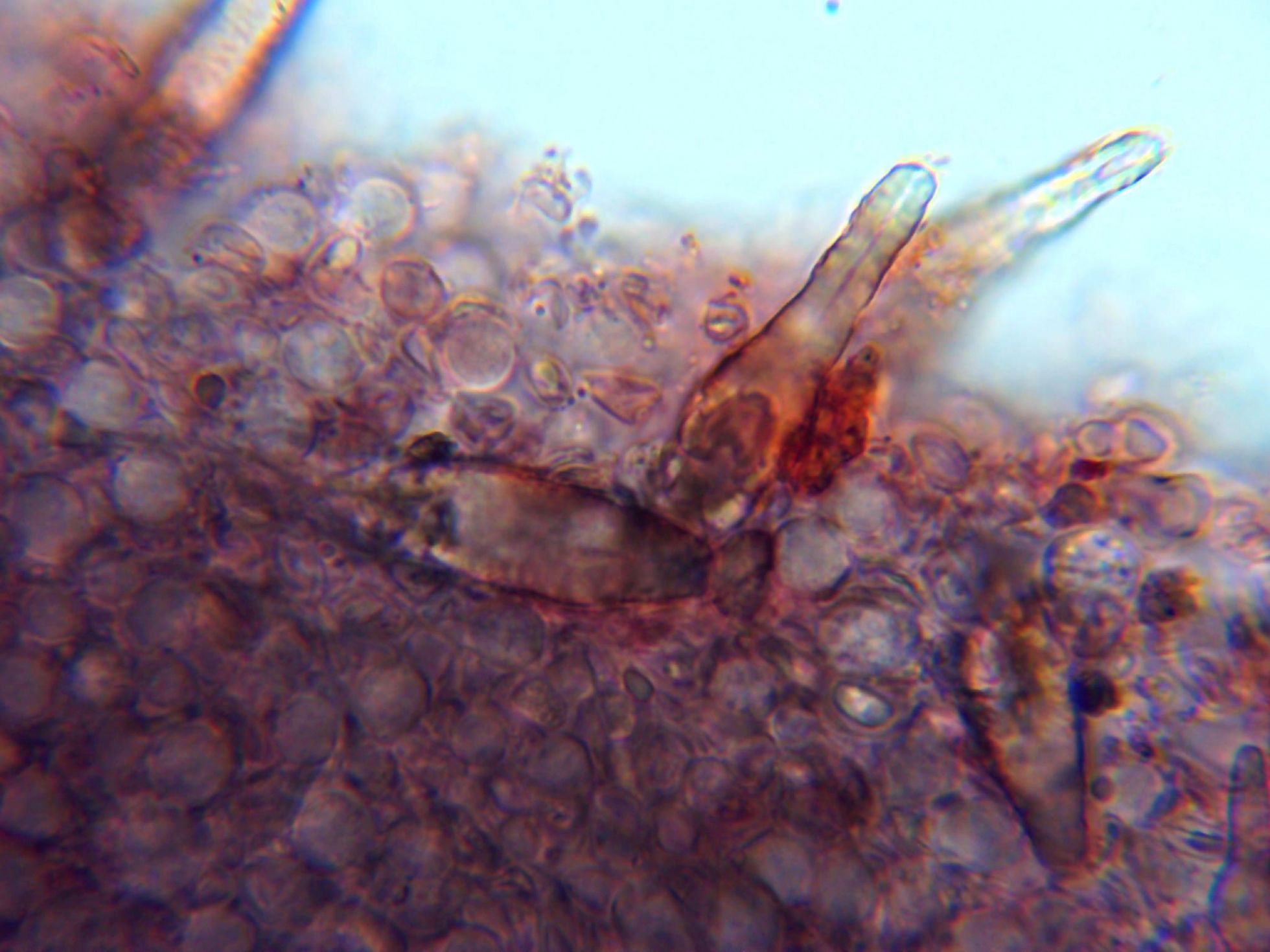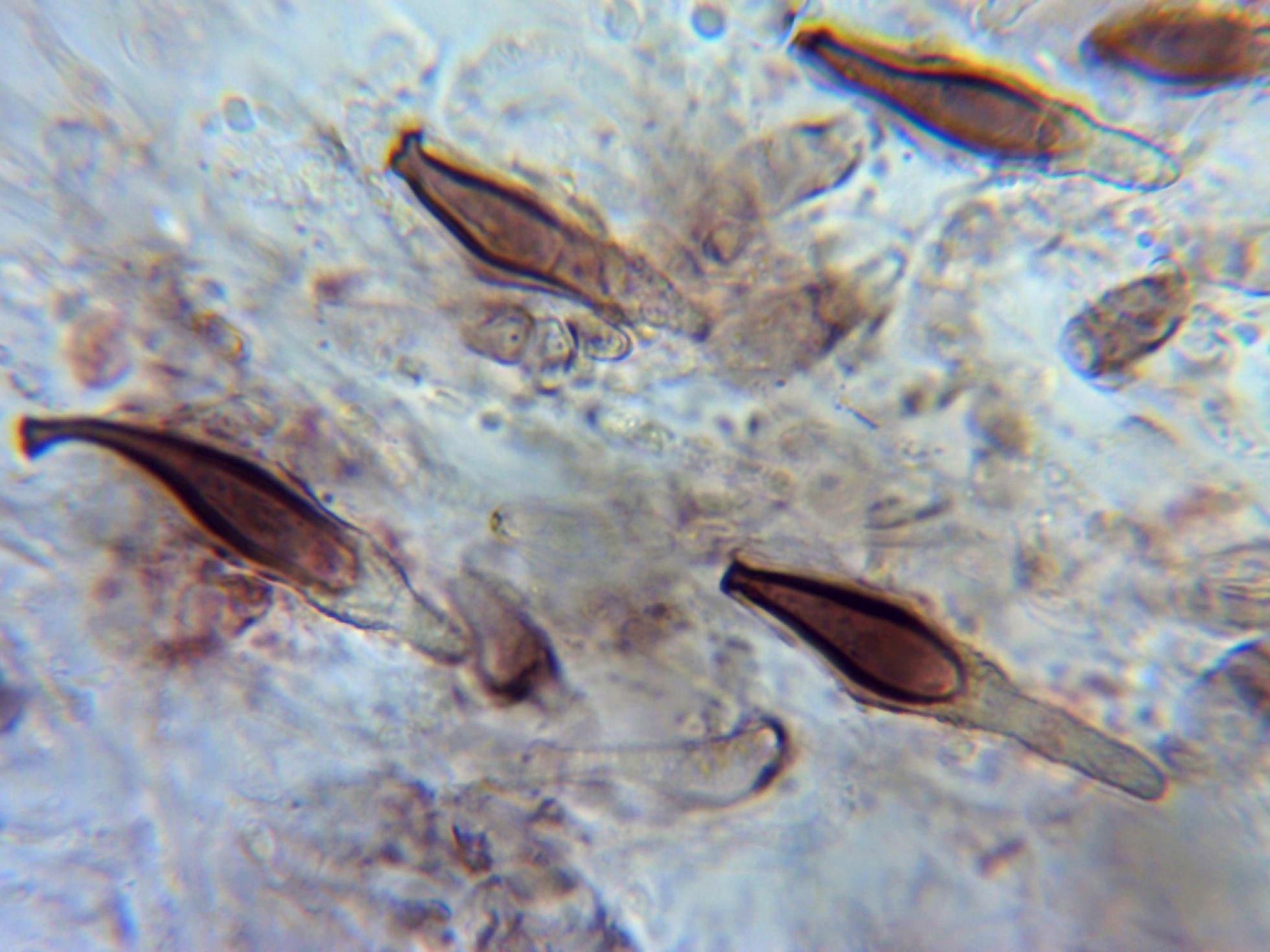 Dos imágenes de los cistidios metuloides y fuertemente incrustados en la parte superior, entre 31 y 43 micras..