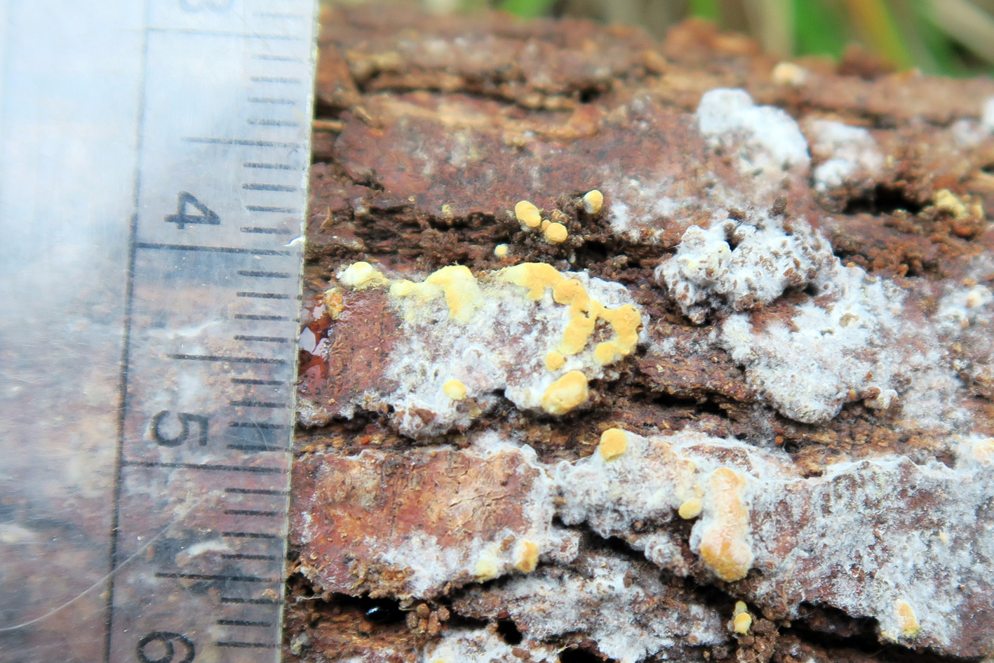 Os presento una especie fotografiada el domingo pasado bajo un tronco indeterminado en el cauce de un rio. Hasta hoy no me he decidido a averiguar de que se trataba, aunque en este caso ha sido muy fácil ya que por el aspecto, desde el primer momento di por sentado que tenía que tratarse de un Botryobasidium.