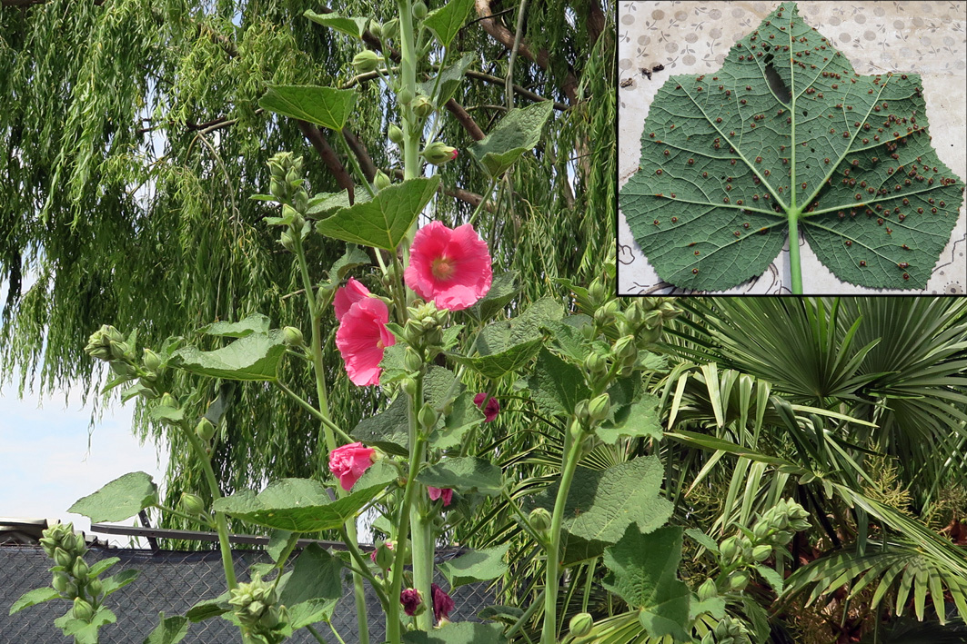 Imagen de Malva real (Alcea rosea) y en la minatura hoja de la misma parasitada por la especie.