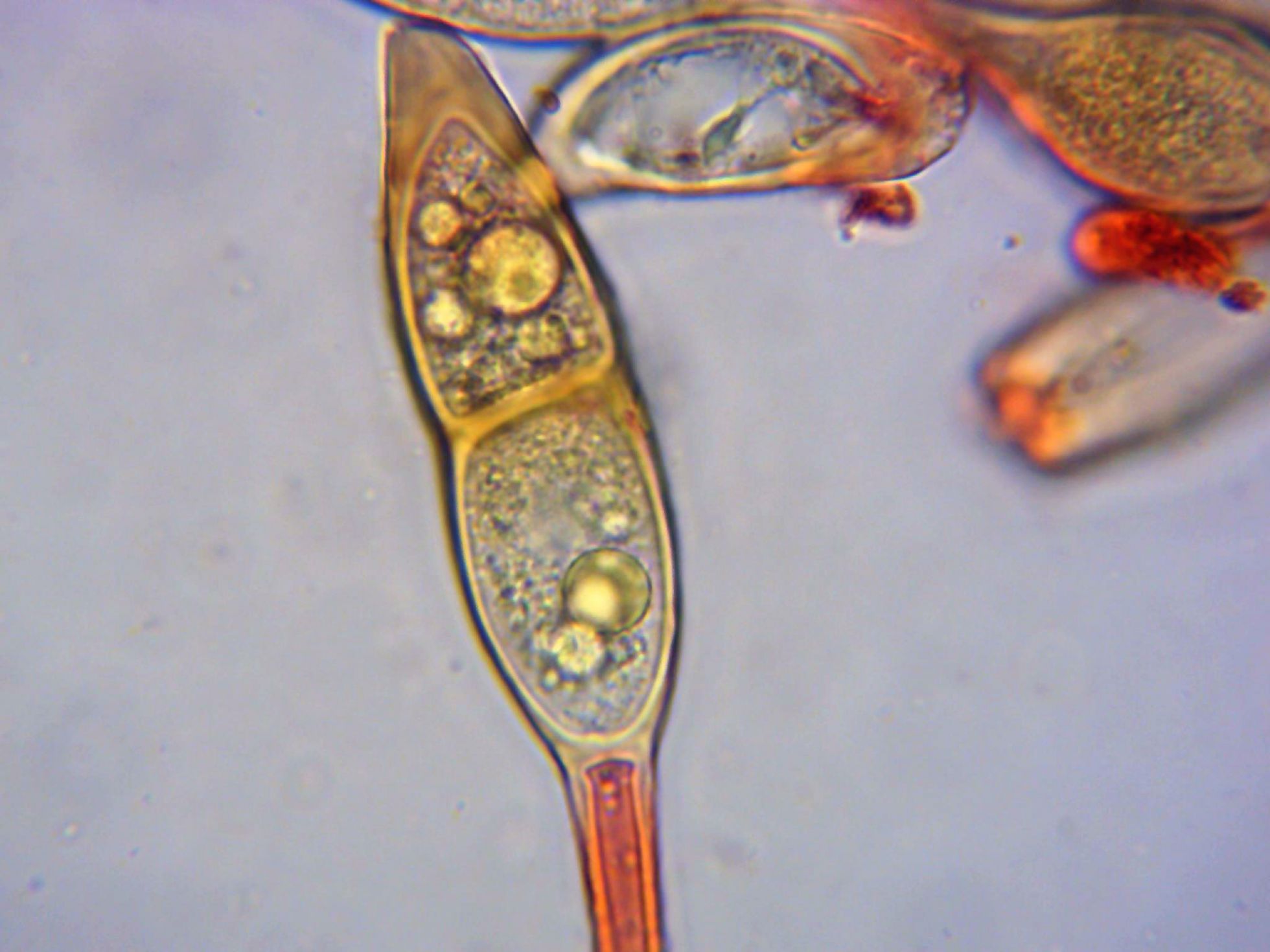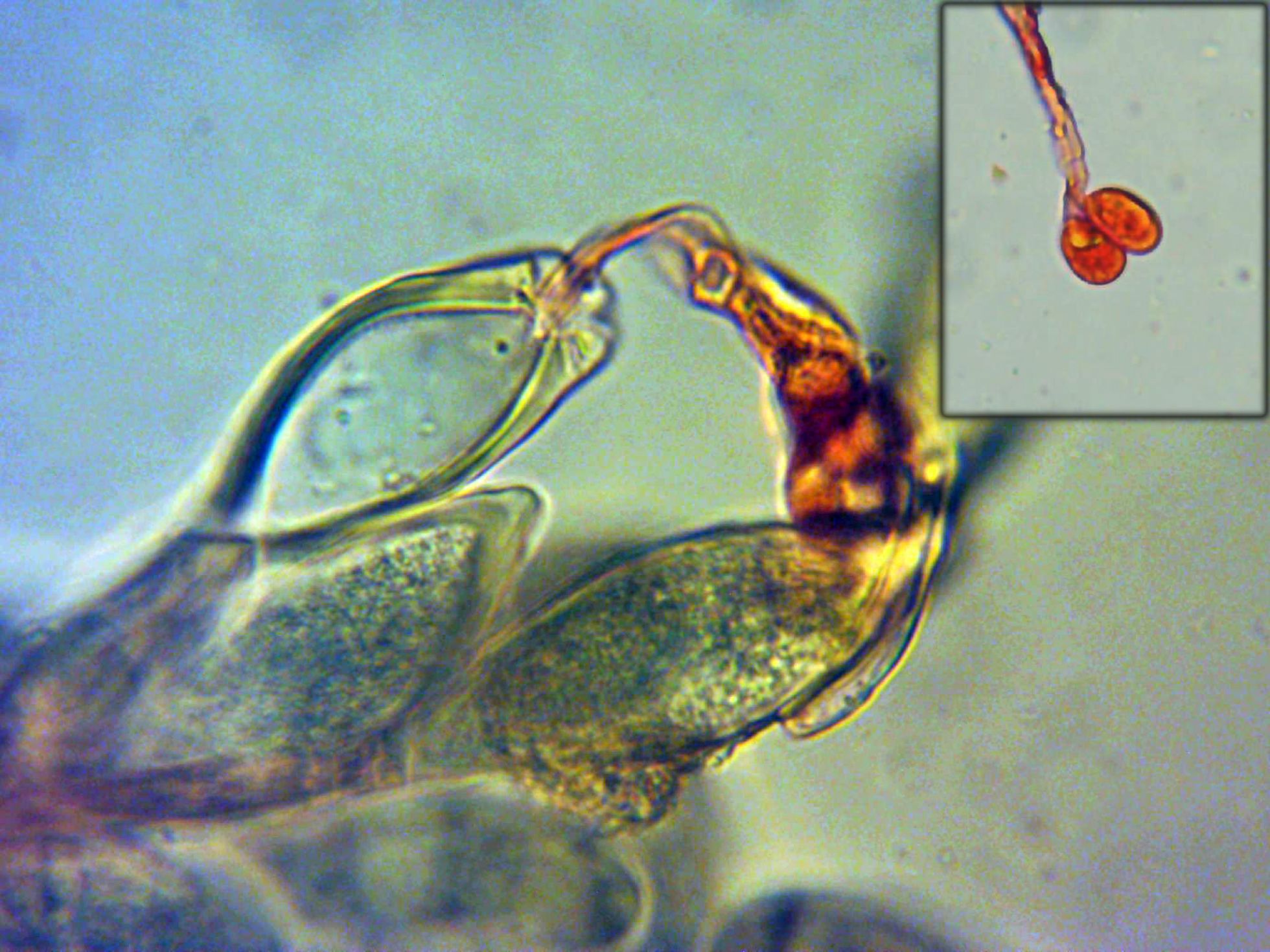 Detalle de una Teliospora generando un basidio a 1000 aumentos.