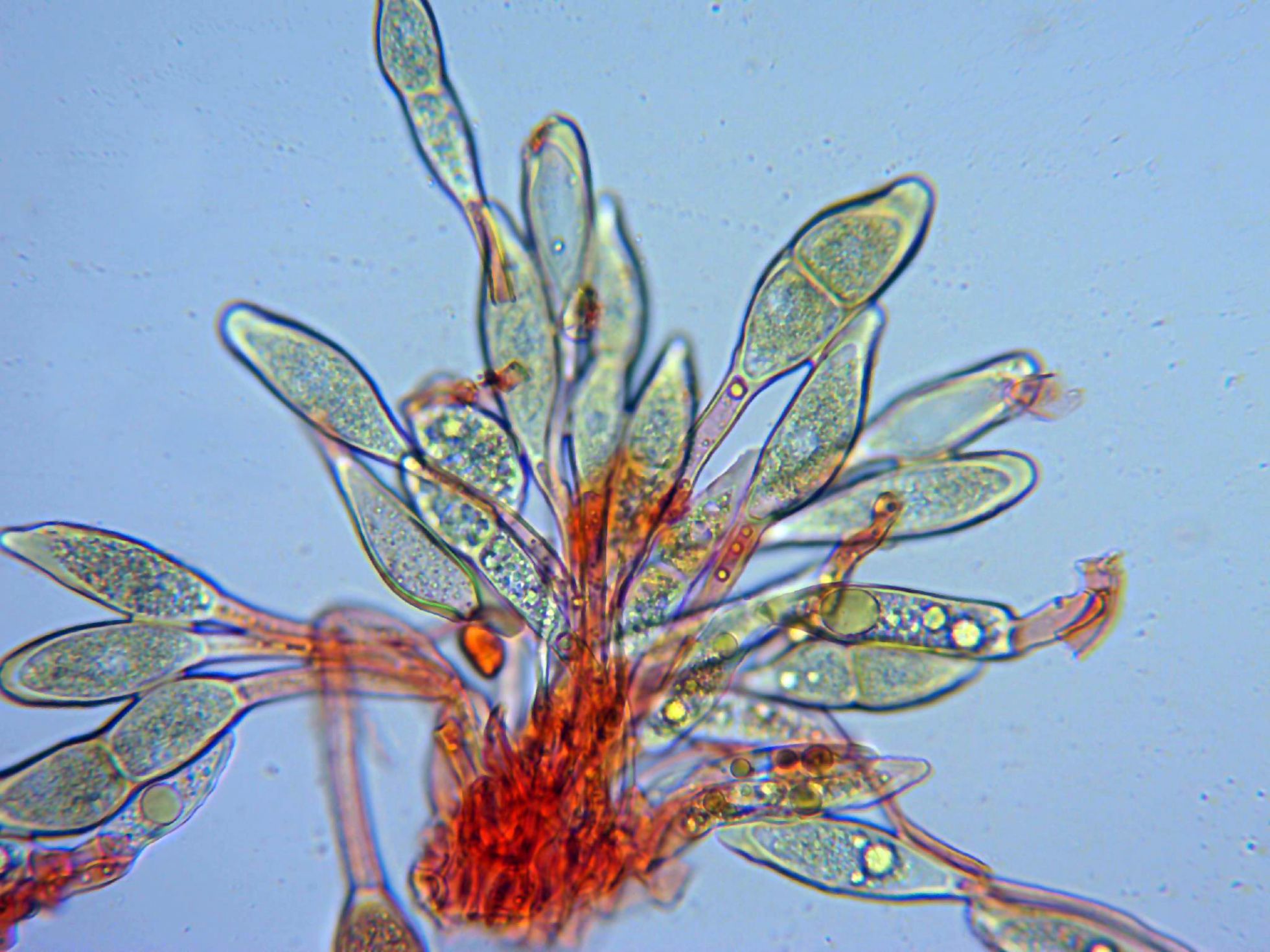Metabasidio a 1000 aumentos con 4 células uninucleadas , cada una de ellas va a producir un esterigma donde en el extremo se formarán las basidiosporas, que serán expulsadas con fuerza al extrerior, se observan estas en la miniatura.