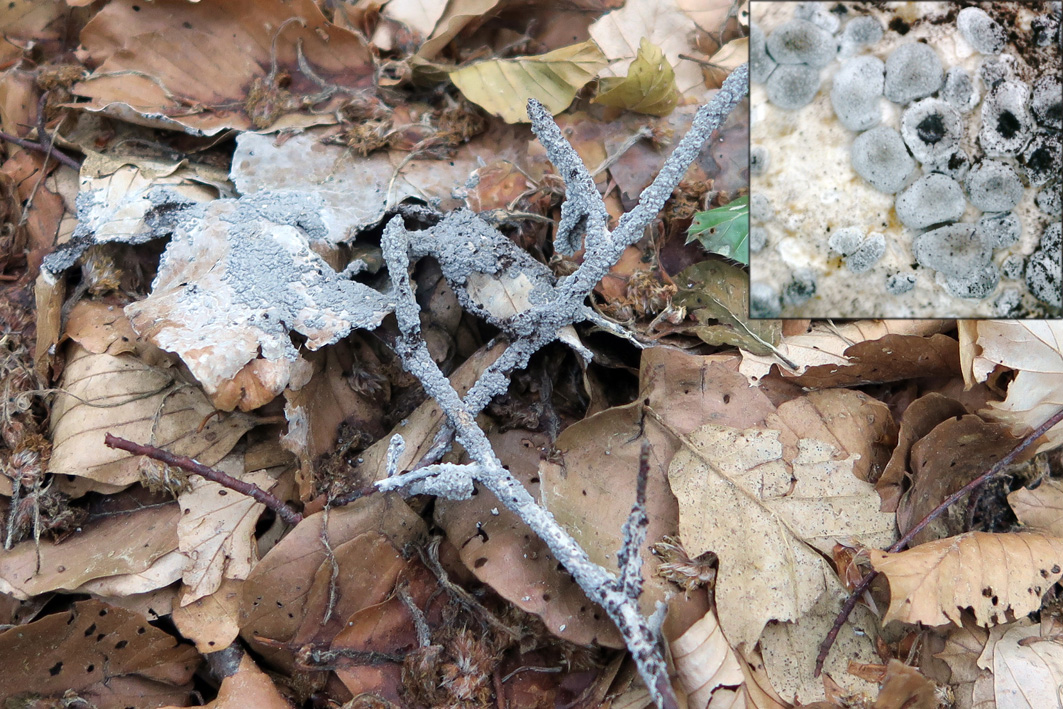 Las muestras que recogí estaban muy húmedas y presentaban una textura gelatinosa, nada que ver con la textura al cabo de pocas horas, de un color gris claro y el interior negruzco y pulverulento. En la imagen de nuestro amigo Roberto se intuye el color grisáceo en la parte izquierda de su imagen. Pongo imagen de la especie en estado seco.