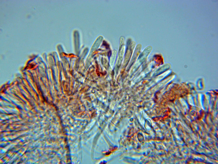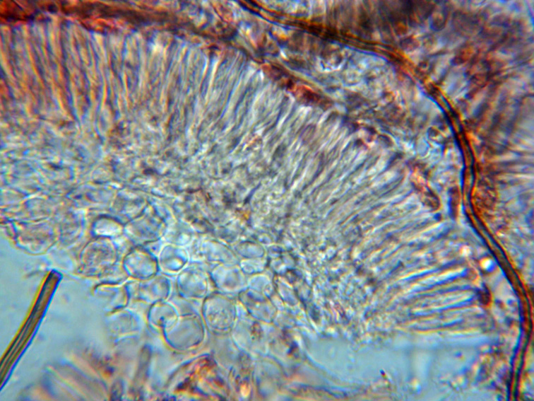 Sección del himenio a 1000 aumentos, con las ascas en la parte superior y en la inferior las células redondeadas del excípulo ectal.