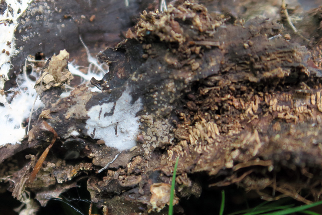 Hoy os presento un pequeño Ascomiceto, fotografiado en hayedo el pasado 12 de Junio, bajo un tronco podrido, compartiendo espacio con una Peniophora y unas cuantas especies más.