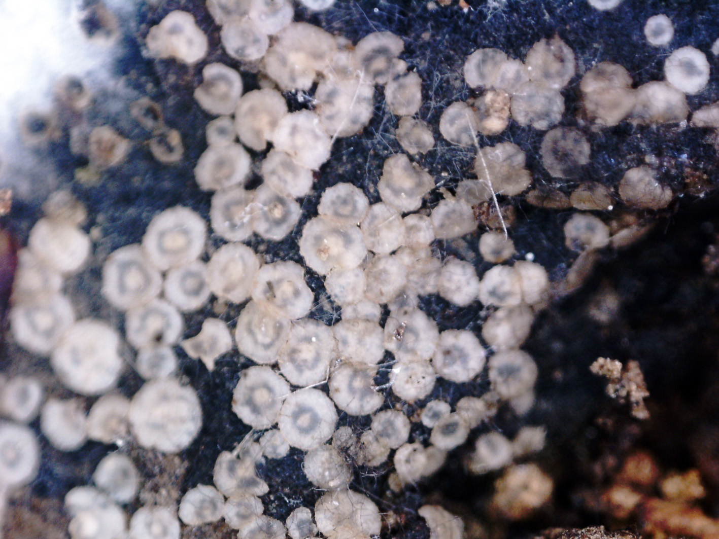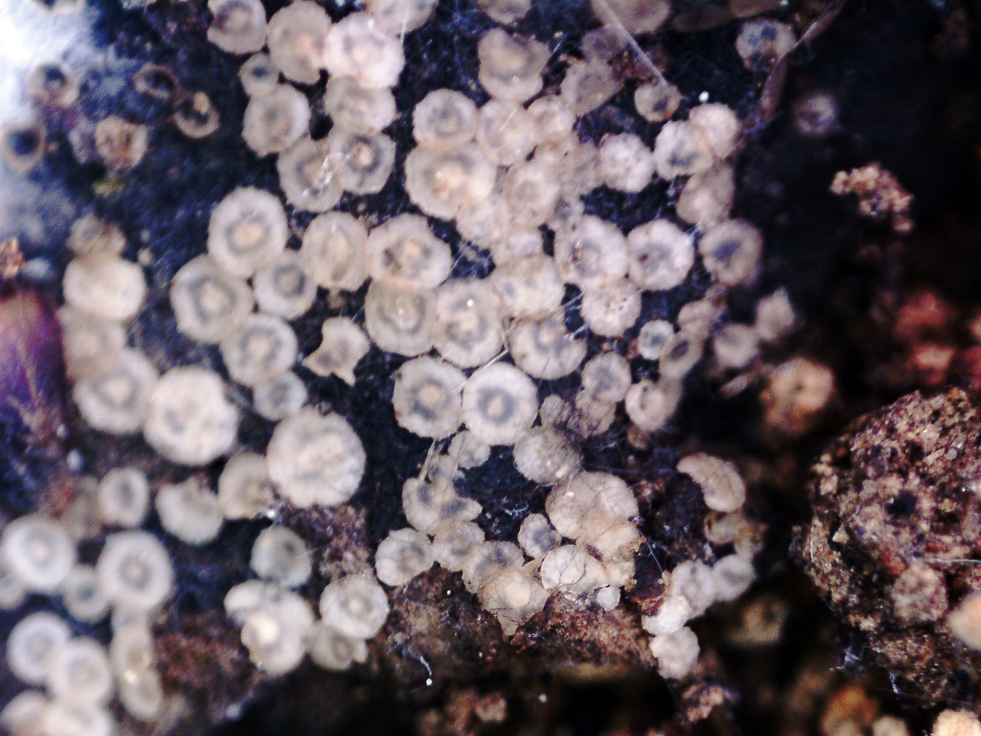 Apotecios de muy pequeño tamaño, ninguno llegaba ni de lejos a 1 mm. de diámetro, con forma de disco o plato aplanado y bordes irregulares, de color pardo violáceo y borde blanquecino, careciendo totalmente de pié.