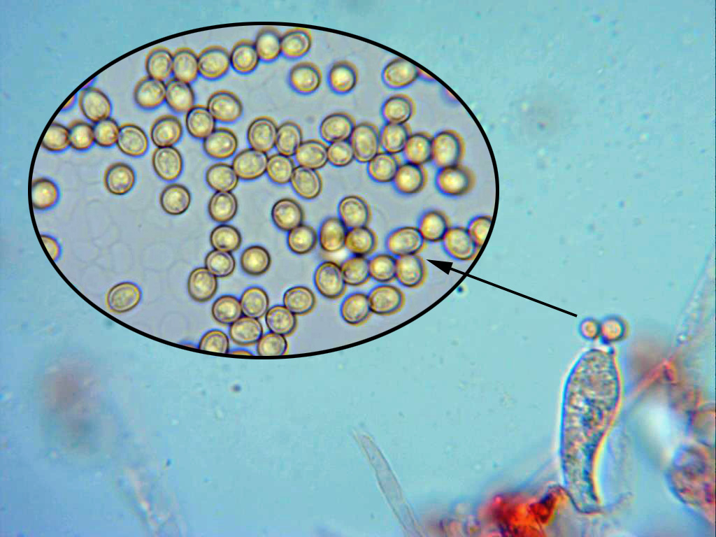Un basidio a 1000 aumentos y las esporas, he preferido usar como reactivo KOH, para ver si oscurecían a marrón, han permanecido claras, elípticas, lisas y de pared gruesa, en mis mediciones un poco por debajo de la bibliografía consultada, 5,2;6,8 X 4,1;4,8.