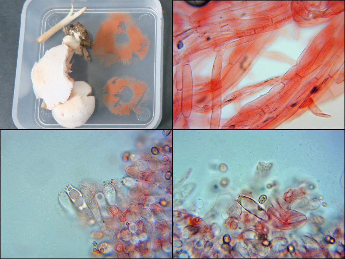 La esporada de un color pardo rosado bastante subido, en la imagen de la derecha arriba, la pileipellis con células terminadas de forma redondeada a 400 aumentos. En la parte de abajo 2 imágenes de los basidios tetraspóricos.