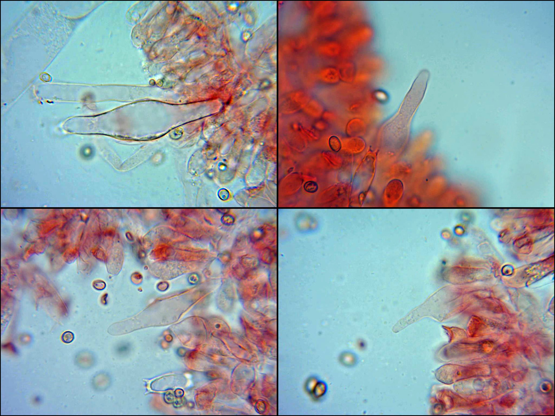 Imágenes de los cistidios, en la parte superior dos imágenes de Pleurocistidios y en la parte inferior dos de los Queilocistidios, muy parecidos y de forma entre fusiformes y lageniformes, bastante abundantes en la muestra.