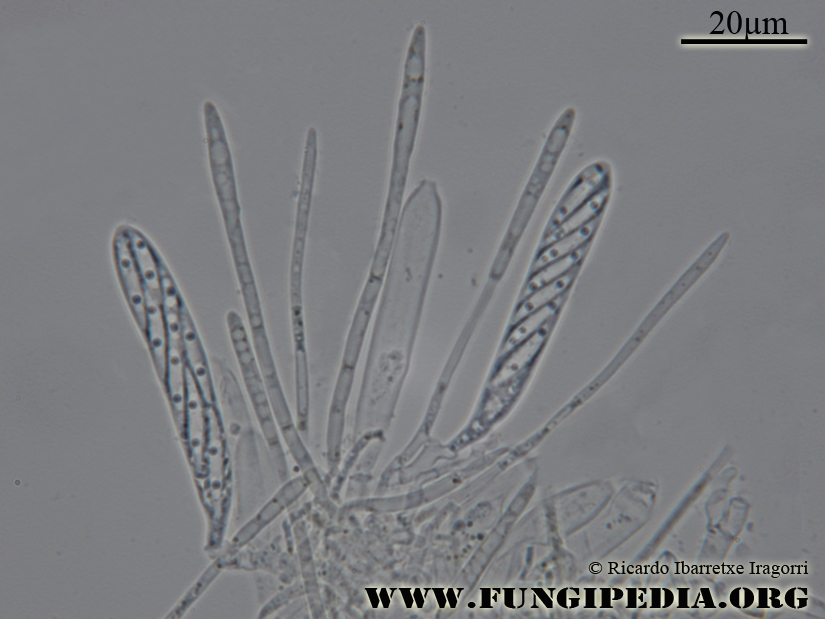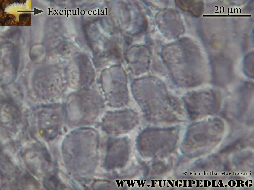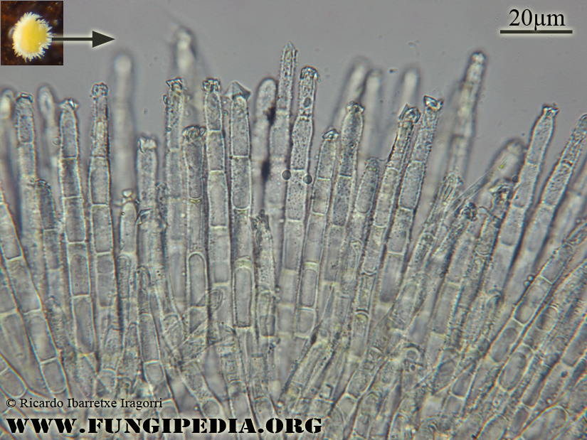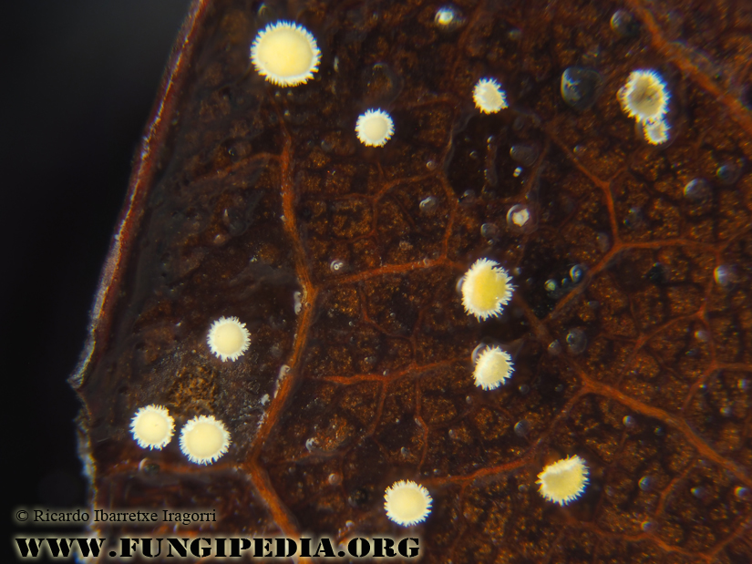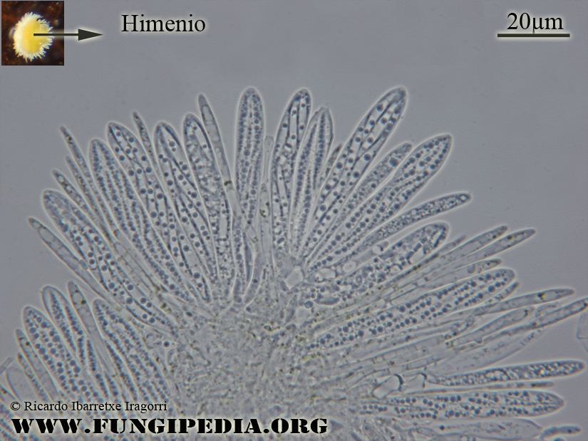 Ascoma de pequeño tamaño 282-496 µm según nuestra muesta, recolectada en hoja de Quercus. De himenio amarillento y pelos marginales blancos, antíguamente pertenecía el Genero Lachnum. Las ascas tienen una reacción hemiamiloide en IKI, no expuesta en este post, el yodo se evapora rápidamente y exige hacer la preparación al momento de lo contrario no seremos capaces de verla.